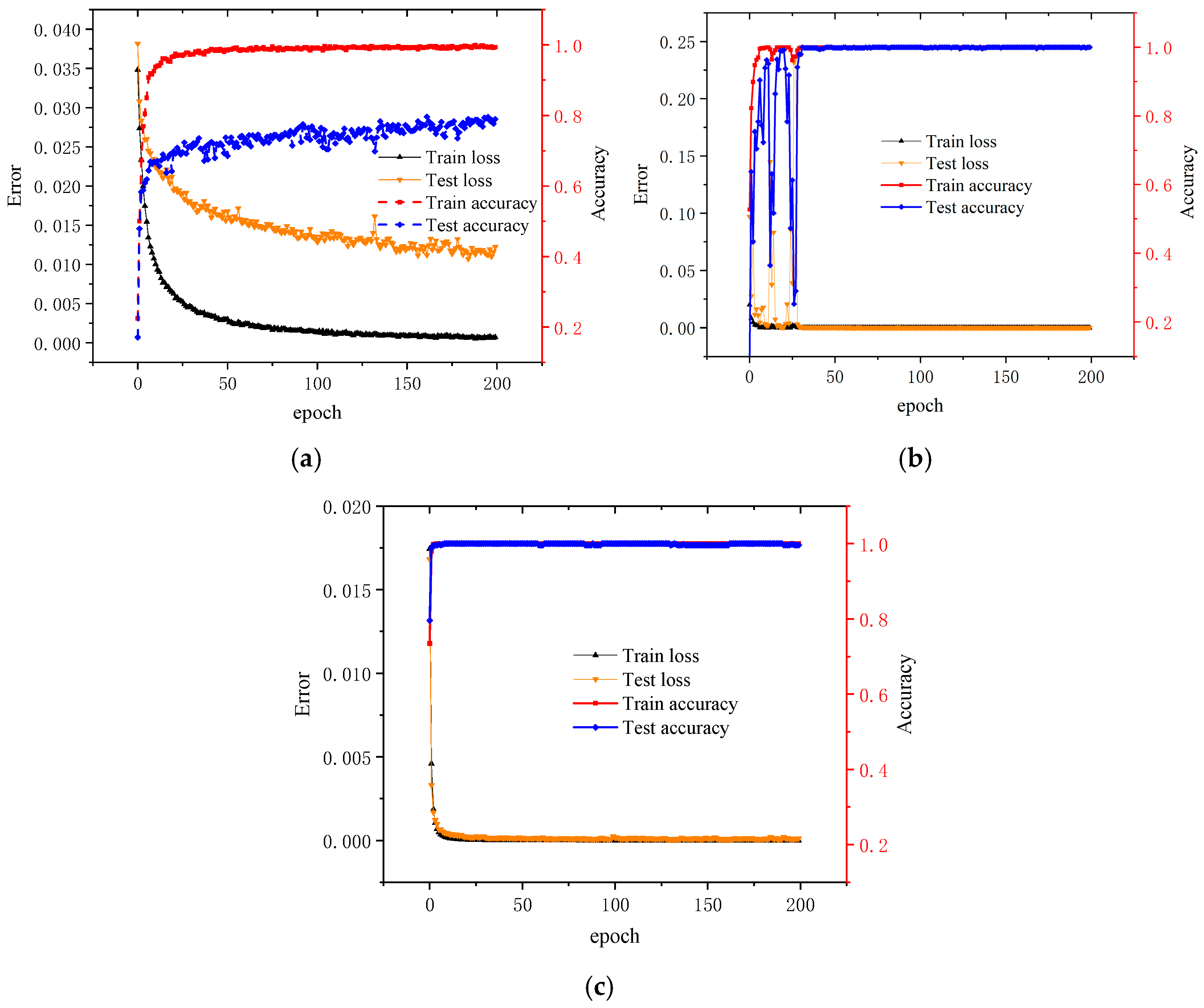Table 4 to diagnose engine fault data, we select data from three sensors: the first cylinder head (1H), the first cylinder block (1B), and the third cylinder head (3H). Each dataset includes three engine speeds: 1600 rpm, 2000 rpm, and 2300 rpm. Among the fault types, abnormal injection pressure, abnormal fuel injection, and abnormal injection advance angle occur simultaneously in all cylinders, while abnormal valve clearance occurs only in the first cylinder. Each fault type has 200 samples, with each sample containing data for one engine cycle. The ratio of the training set, test set, and validation set is 3:1:1., and each model was trained for 200 epochs.