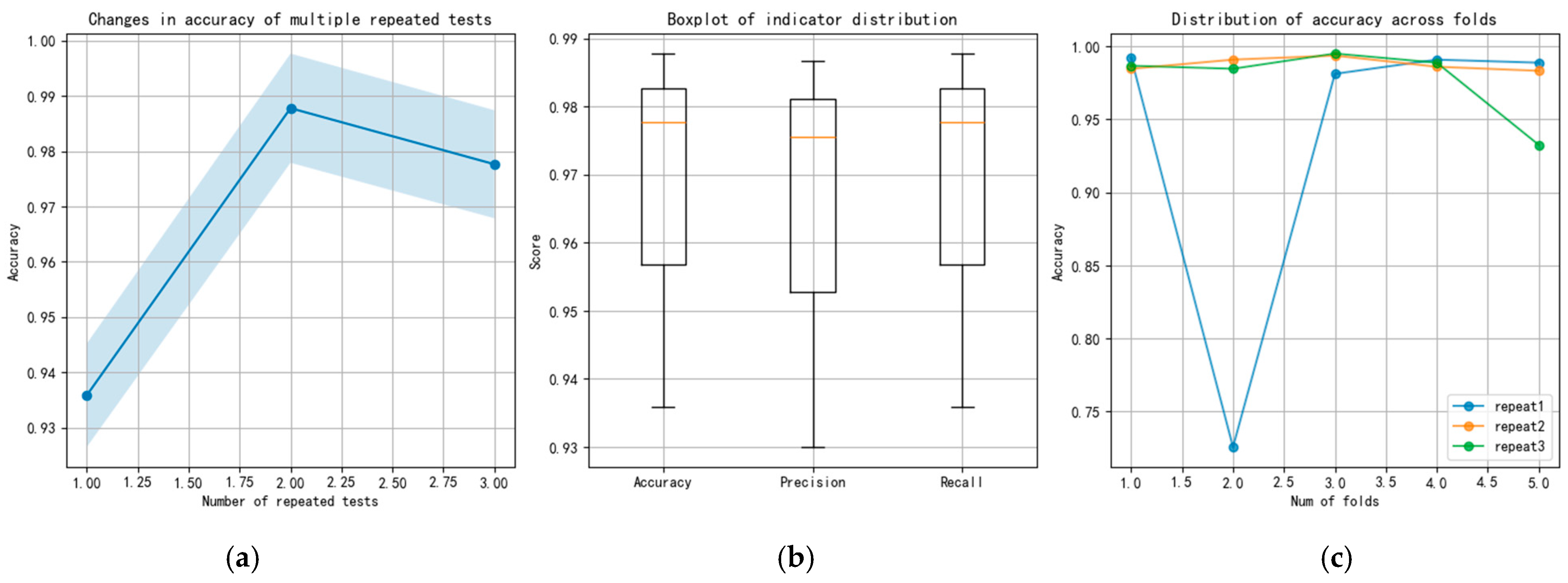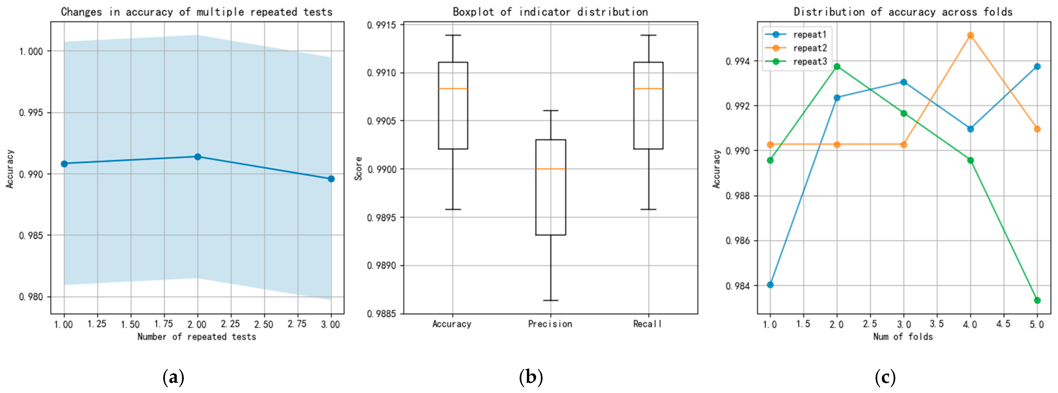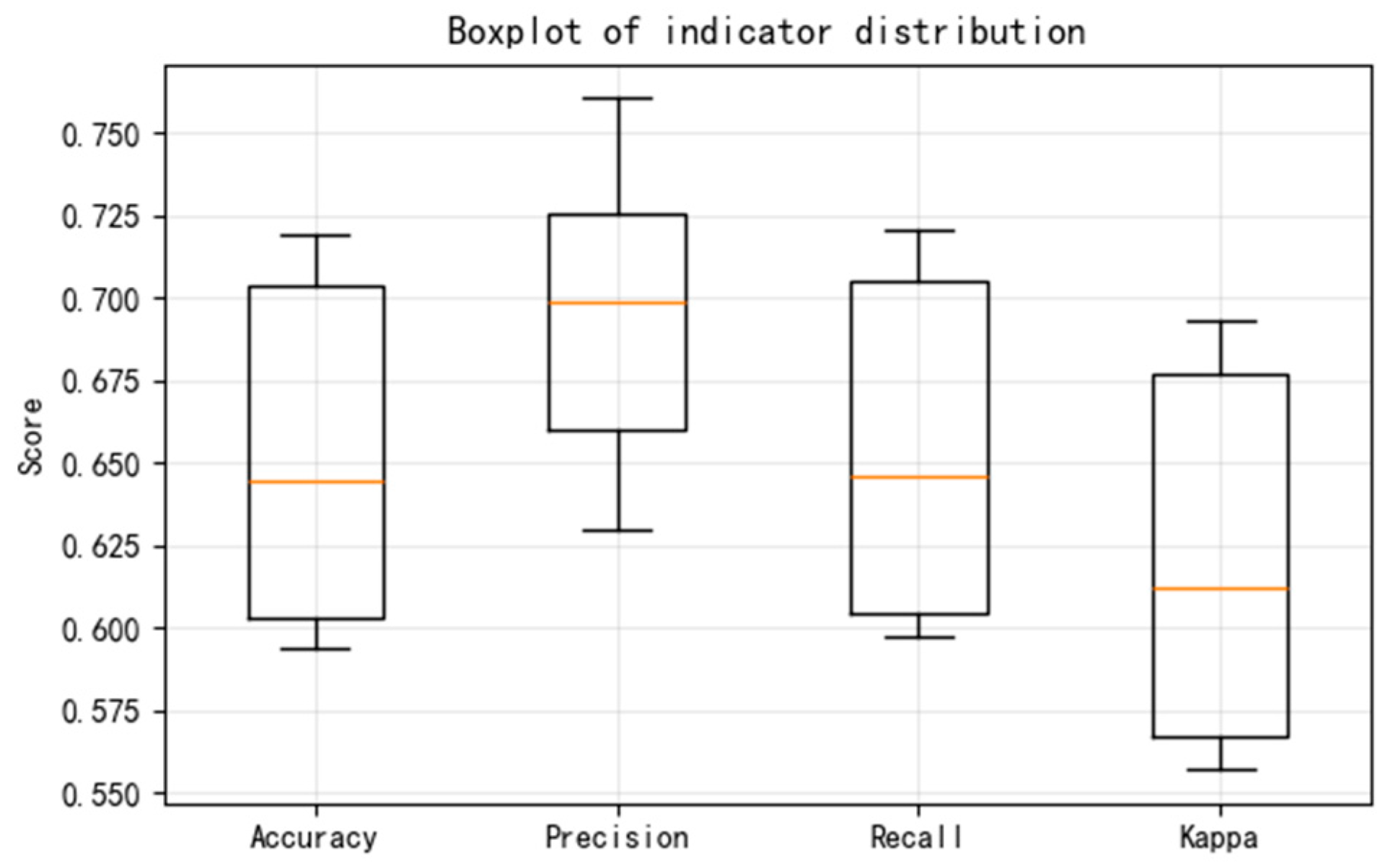 Figure 7 shows that in the repeated tests of the CNN method, all indicators vary between 0.8 and 0.85, with moderate accuracy. Both ResNet and TFDN achieve relatively high accuracy. Among them, the accuracy of ResNet fluctuates between 0.93 and 0.99, but it is not very stable—its accuracy drops below 0.75 in one of the folds. In the repeated tests, the accuracy of the TFDN method fluctuates around 0.99, with the lowest accuracy near 0.984. It is the best performing among the three methods. As can be seen from the boxplot, among the three methods, the indicators of CNN and TFDN are relatively stable, while those of ResNet show significant fluctuations.