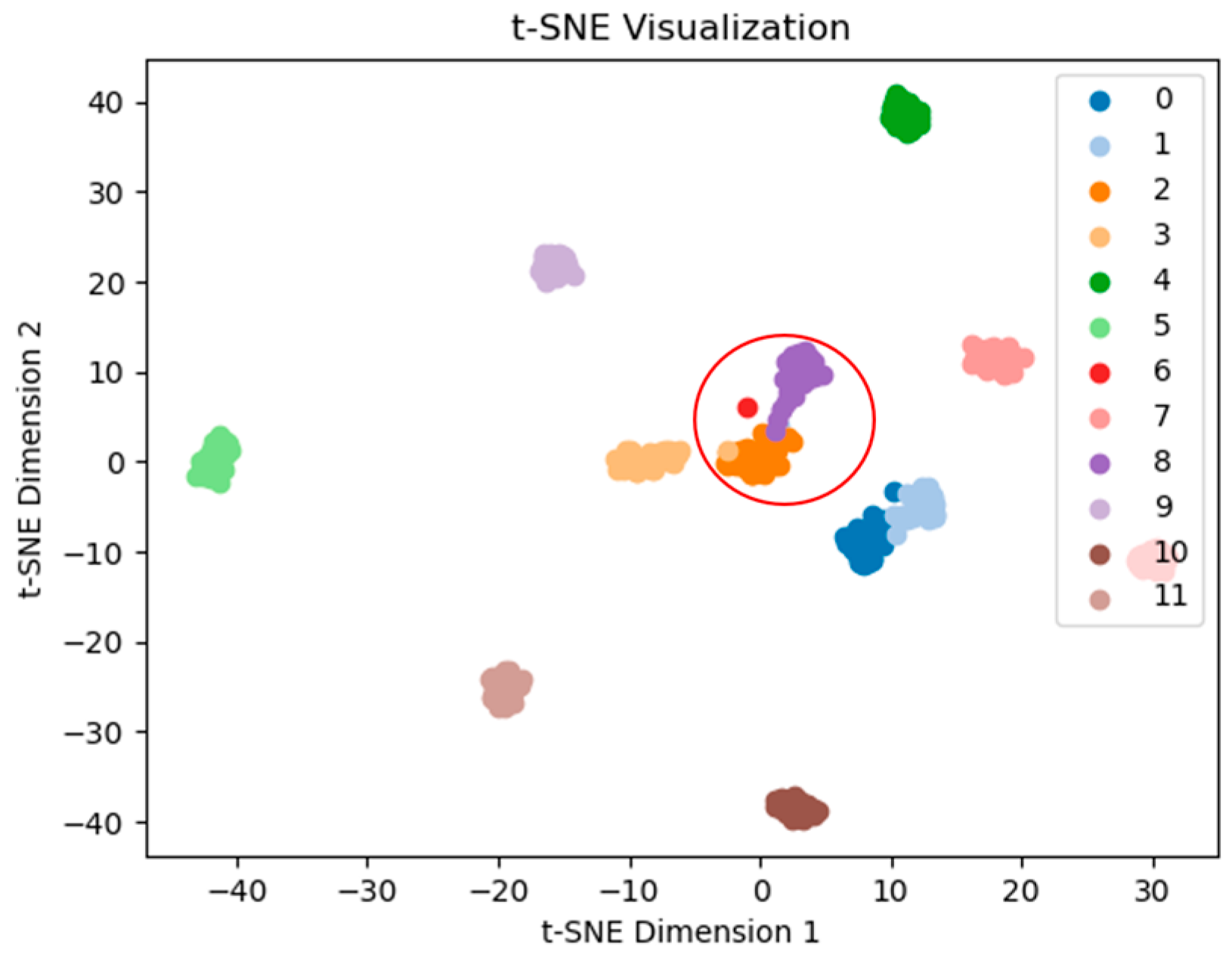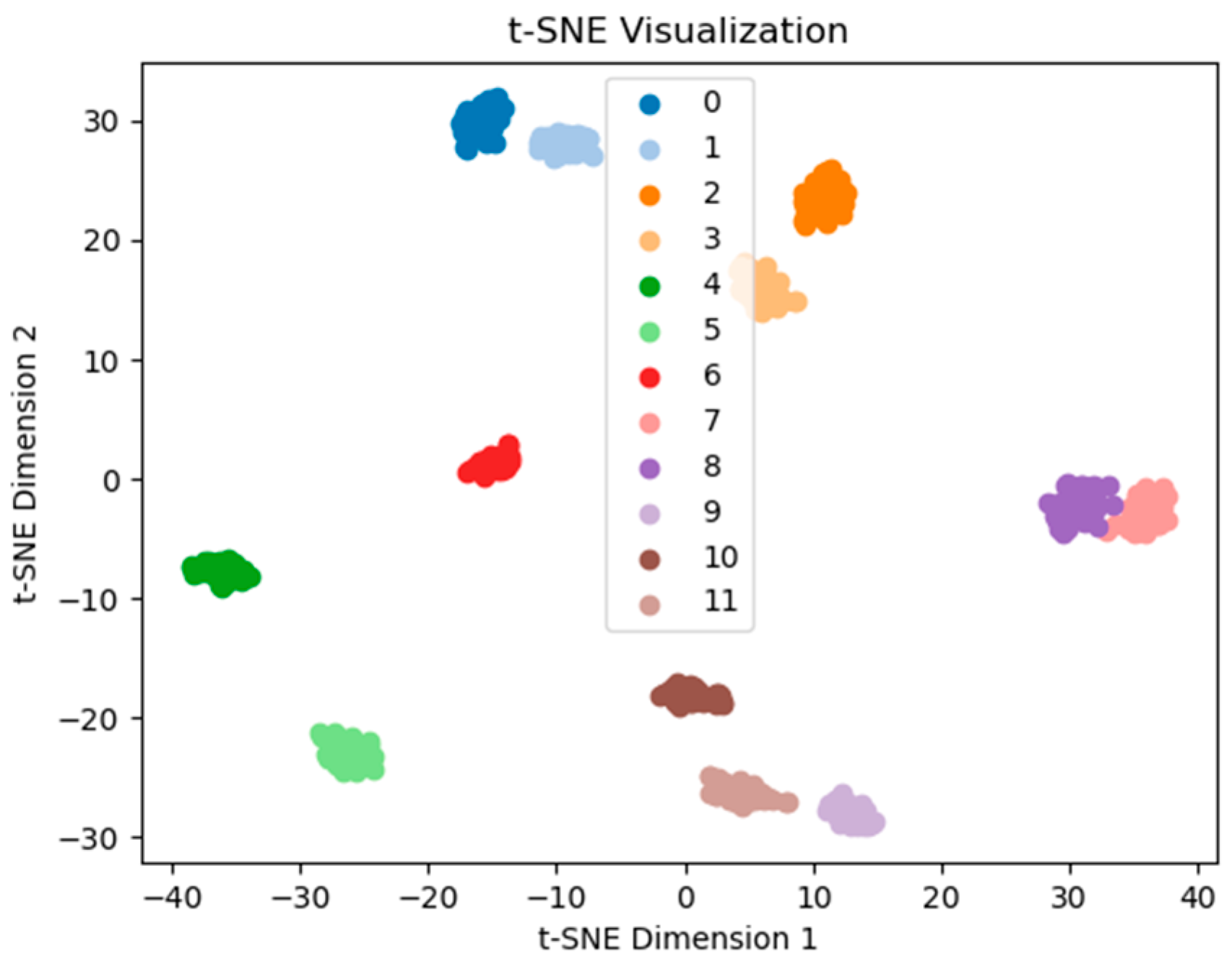 The feature extraction results of the network are visualized using t-SNE, with the 3H dataset at 2000 r/min as an example. The feature extraction performance of the network is demonstrated before the final classification.
