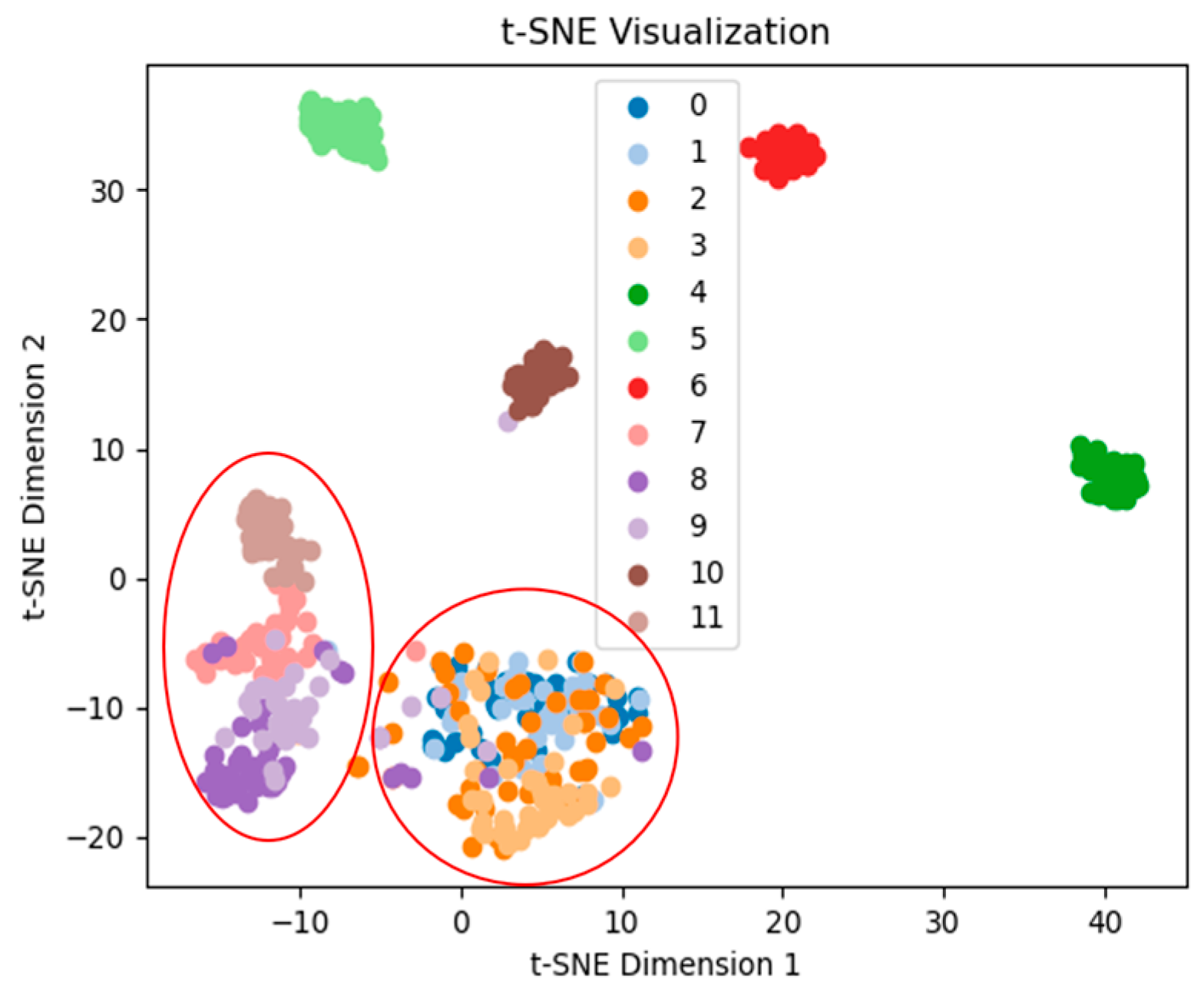 Figure 12 shows that the clustering effect of CNN after feature extraction is poor, with confusion among multiple types of fault data. To quantify the t-SNE results, we calculated three parameters for each result: Silhouette Score, Calinski–Harabasz index, and Davies–Bouldin index. Among them, the larger the Calinski–Harabasz index, the better; the smaller the other two indices, the better. The results are shown in