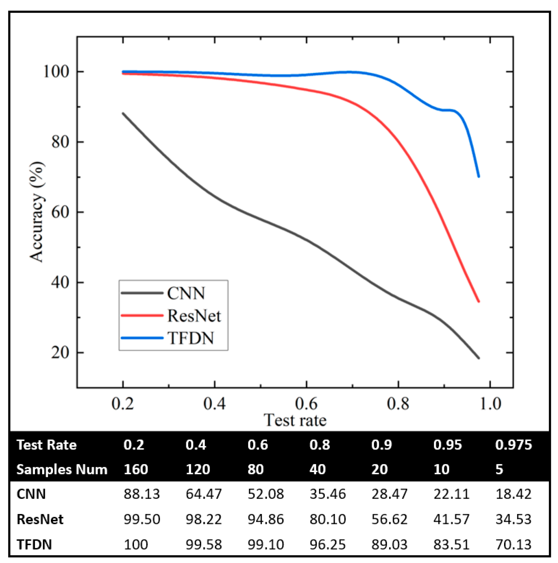 Figure 13. As the test rate increases, the amount of training data decreases, leading to a continuous decline in the diagnostic accuracy of all three algorithms. The accuracy of CNN drops rapidly with the increase in test rate, and when the test rate is 0.975, its accuracy is only 18.42%. For ResNet, the accuracy does not decrease significantly until the test rate exceeds 0.6. When the test rate is 0.975, its accuracy is 34.53%. On the other hand, TFDN’s accuracy begins to drop rapidly only when the test rate exceeds 0.9. Even when each category has only five training samples, TFDN still achieves an accuracy of 70%. To verify the stability of TFDN under the condition of data scarcity, the proposed method is subjected to 5 repeated tests, and the variation ranges of various indicators are calculated. The results are shown in