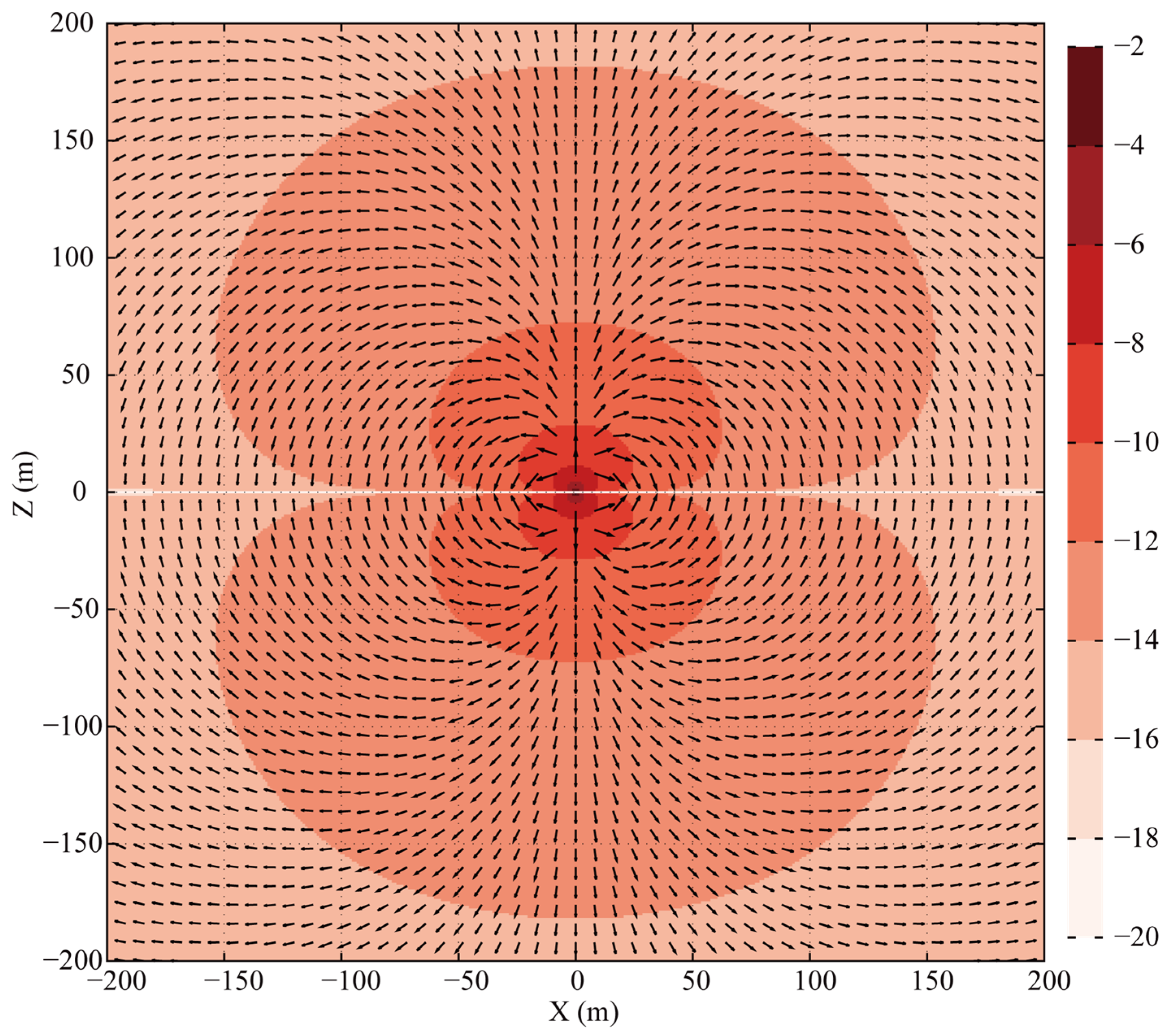 - The low-frequency diffusive electromagnetic field generated by an electric dipole in marine environments can be mathematically transformed into corresponding fictitious electromagnetic waves in the fictitious wave domain. These waves exhibit no physical energy attenuation, allowing both their kinematic and dynamic characteristics to be used for analyzing the propagation behavior of low-frequency EM fields.