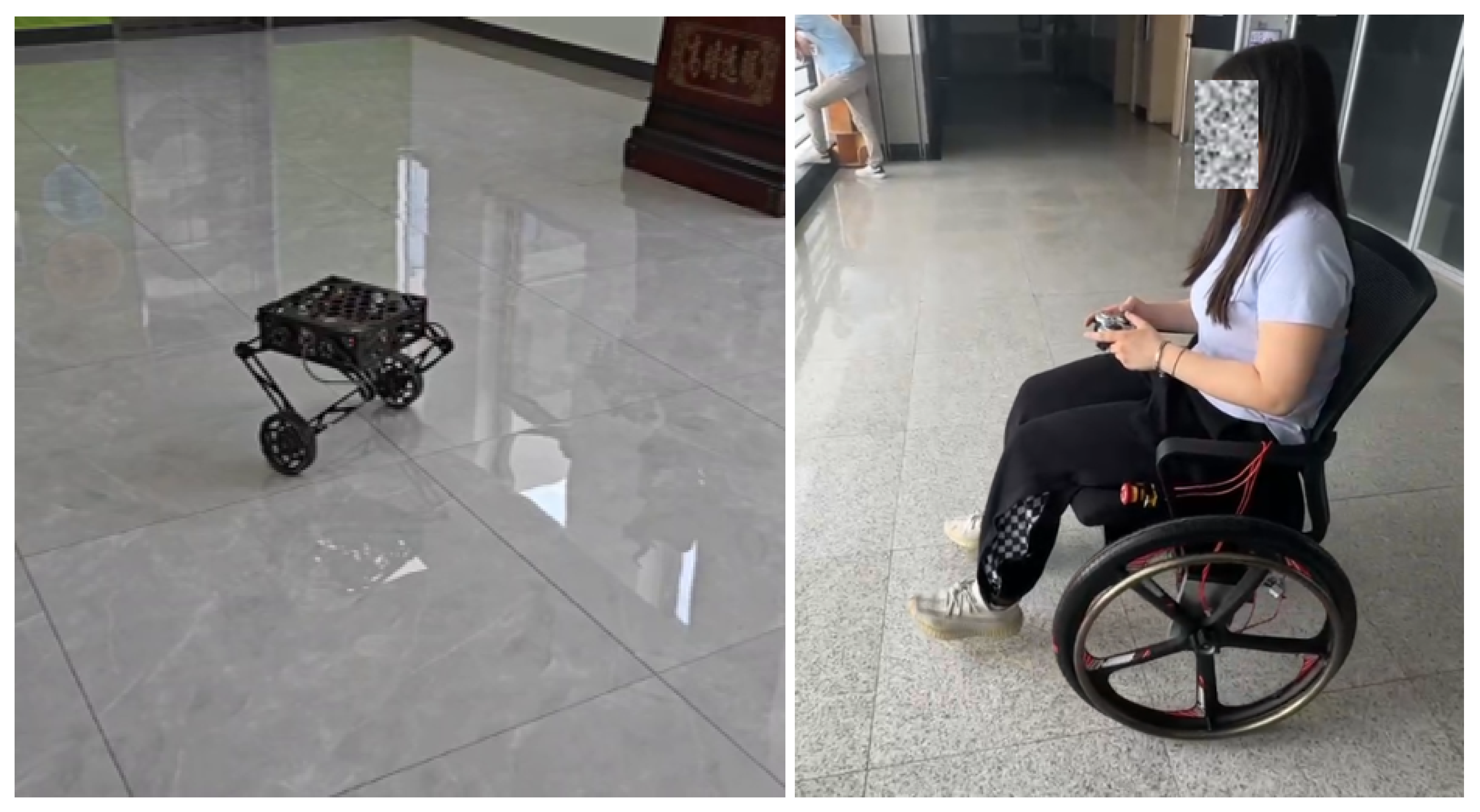 Figure 1. The small robot employs a five-bar linkage mechanism as the leg, acting as an active suspension system, enabling the robot to overcome common indoor and urban obstacles such as thresholds, curbs, and uneven pavement; traverse uneven terrain; and even jump. The self-balancing wheelchair utilizes a force/torque sensor to estimate the person’s mass and center of mass (CoM). The dynamic models of both robots can be updated in real time. An LQR controller, with online computation, is employed to maintain balance based on the updated dynamic models, while the rotation speed is controlled by a PD controller. Crucially, this same LQR controller also regulates the robot’s forward/backward translational speed by tracking a desired velocity command, leveraging its inherent ability to control the entire sagittal-plane state vector. The proposed system is validated through extensive tests, demonstrating its ability to maintain balance, navigate obstacles, and perform dynamic maneuvers such as jumping. The main contributions of the paper are listed as follows.