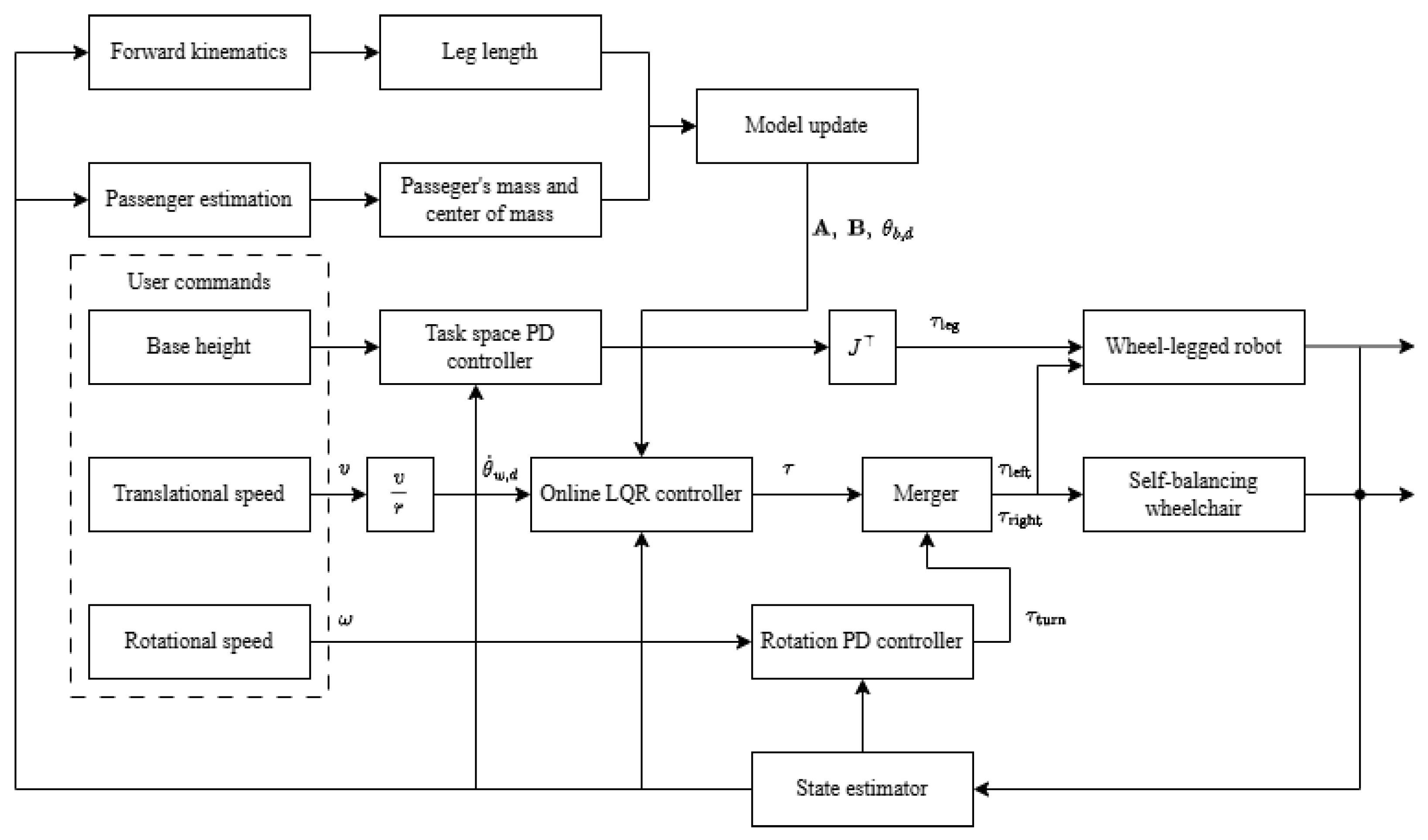 This paper presented a unified control framework to address the fundamental challenge of model variations in two distinct self-balancing robot platforms: a wheel-legged robot and a human-carrying wheelchair. The core of our approach lies in the choice of an online model-updating LQR controller as the universal balancing core. This design was strategically selected because the LQR provides a principled and computationally tractable optimal control solution, while the real-time model update mechanism directly compensates for the primary source of uncertainty—changes in mass and center of mass. This contrasts methods that treat model variations as unstructured disturbances, enabling our controller to proactively reconfigure for new operating conditions. The wheel-legged robot achieved a 0.1 m jump height and maintained reasonable velocity error, while the wheelchair overcame a 5 cm step with a 3 s settling time while carrying a 55 kg passenger. The model updating algorithm estimated passenger mass and CoM with high accuracy, enabling dynamic adjustments. These results validate the framework’s robustness and potential for applications in personal mobility and assistive robotics, with future work focusing on optimization for complex environments and enhanced sensor integration.