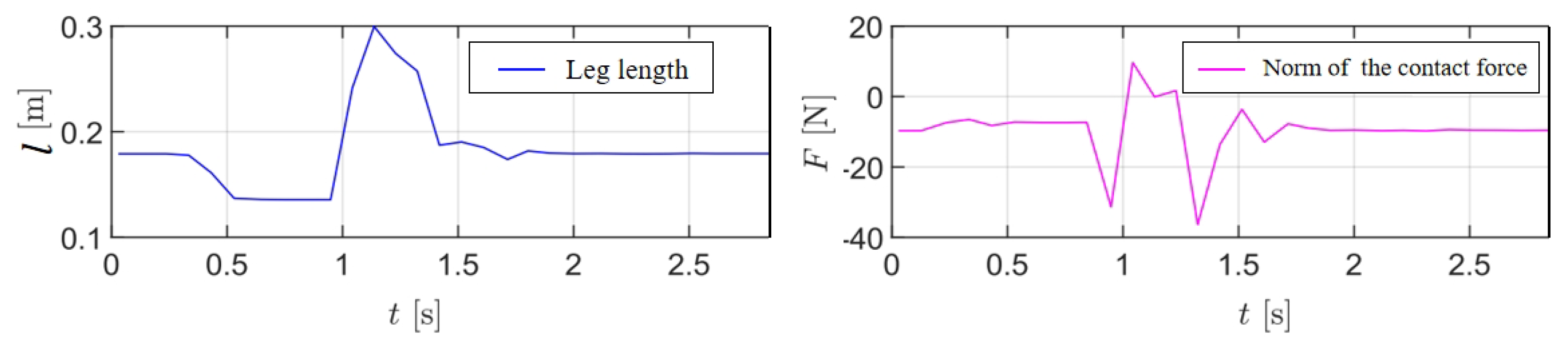 Flight and landing phases (1.1–1.6 s): The legs fully extended during flight (contact force ≈ 0 N), followed by controlled compression during landing to dissipate impact energy.