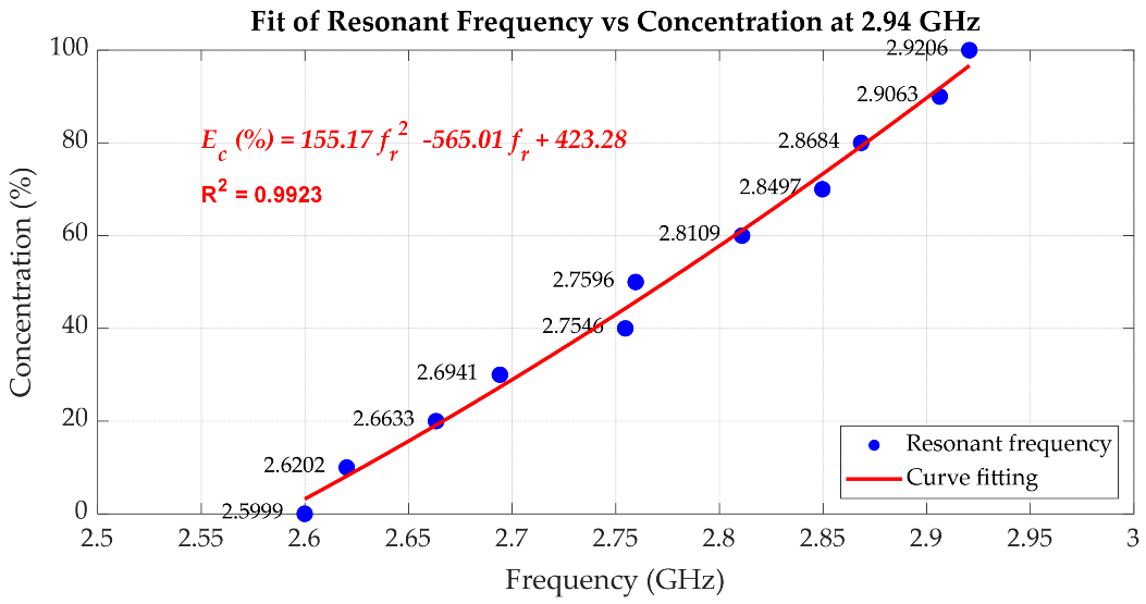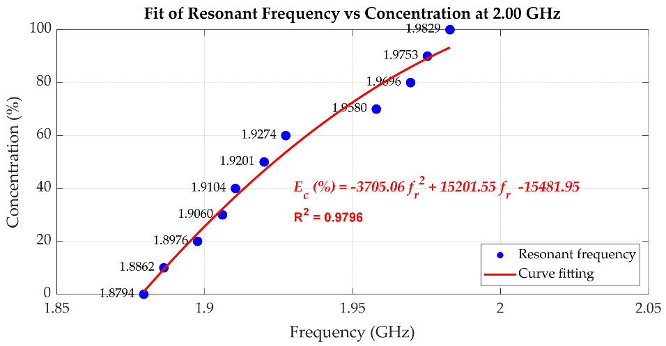 | Resonant Frequency (GHz) | Ethanol Concentration (%) | Ethanol Concentration (%) Extracted from (6) | Absolute Error (% of Ethanol Concentration) |