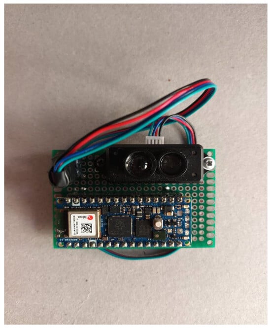 The wearable sensor, integrating the TF mini S LiDAR and the Arduino Nano RP2040, was positioned on the medial side of the left, specifically at the level of the gastrocnemius muscle belly. The choice of the left leg was made solely for consistency across all tests and for practical reasons related to sensor alignment. As the LiDAR beam captures the crossing of the contralateral limb, the selected side does not influence the results, ensuring equivalent measurements if the device were mounted on the opposite leg. Mounting the device on the left calf ensured a stable attachment point and a clear line of sight toward the opposite leg,