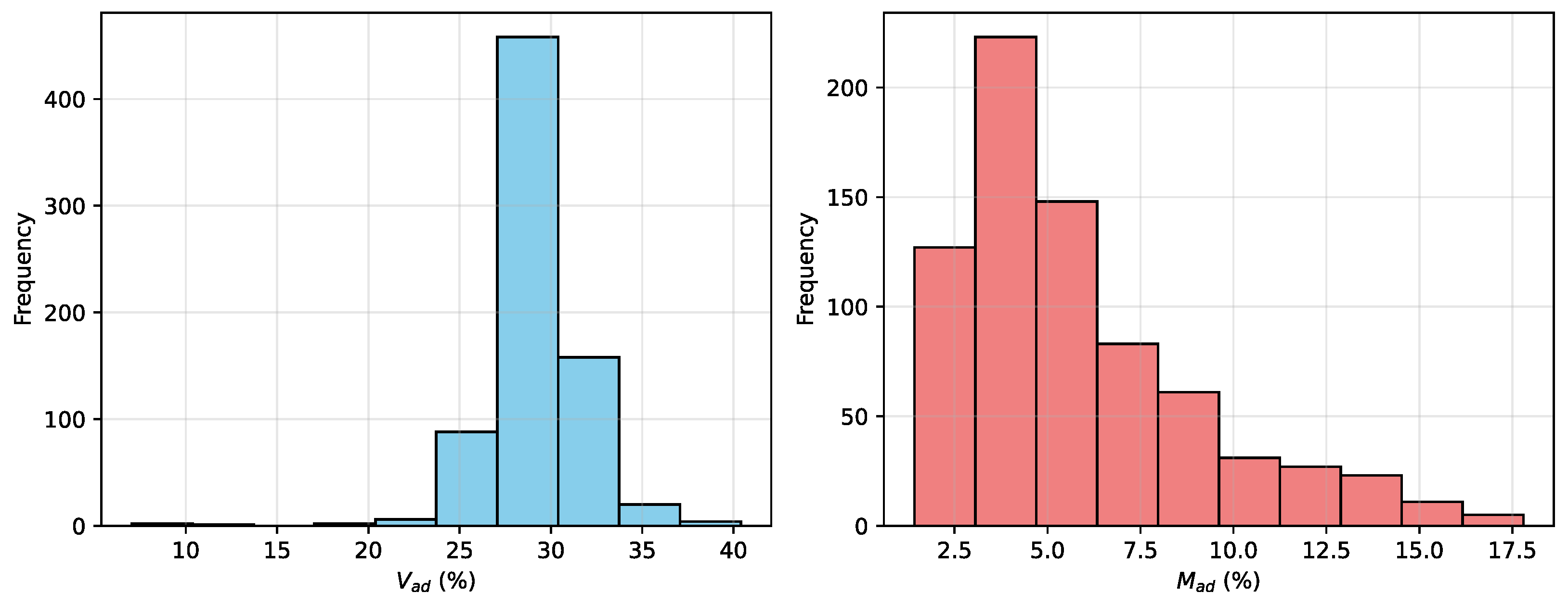 The dataset used in this study comprises two key coal property indicators: Volatile Matter in Air-Dried Basis () and Moisture in Air-Dried Basis (). refers to the content of volatile matter in coal measured under air-dried conditions, which is closely related to coal’s combustibility and gas generation rate. represents the inherent moisture content, a critical parameter for determining combustion efficiency and storage stability. While other indicators (e.g., ash content, calorific value) also reflect coal quality, this study focuses on and because their strong correlation with the vibrational characteristics of organic functional groups makes them highly suitable for NIR analysis.