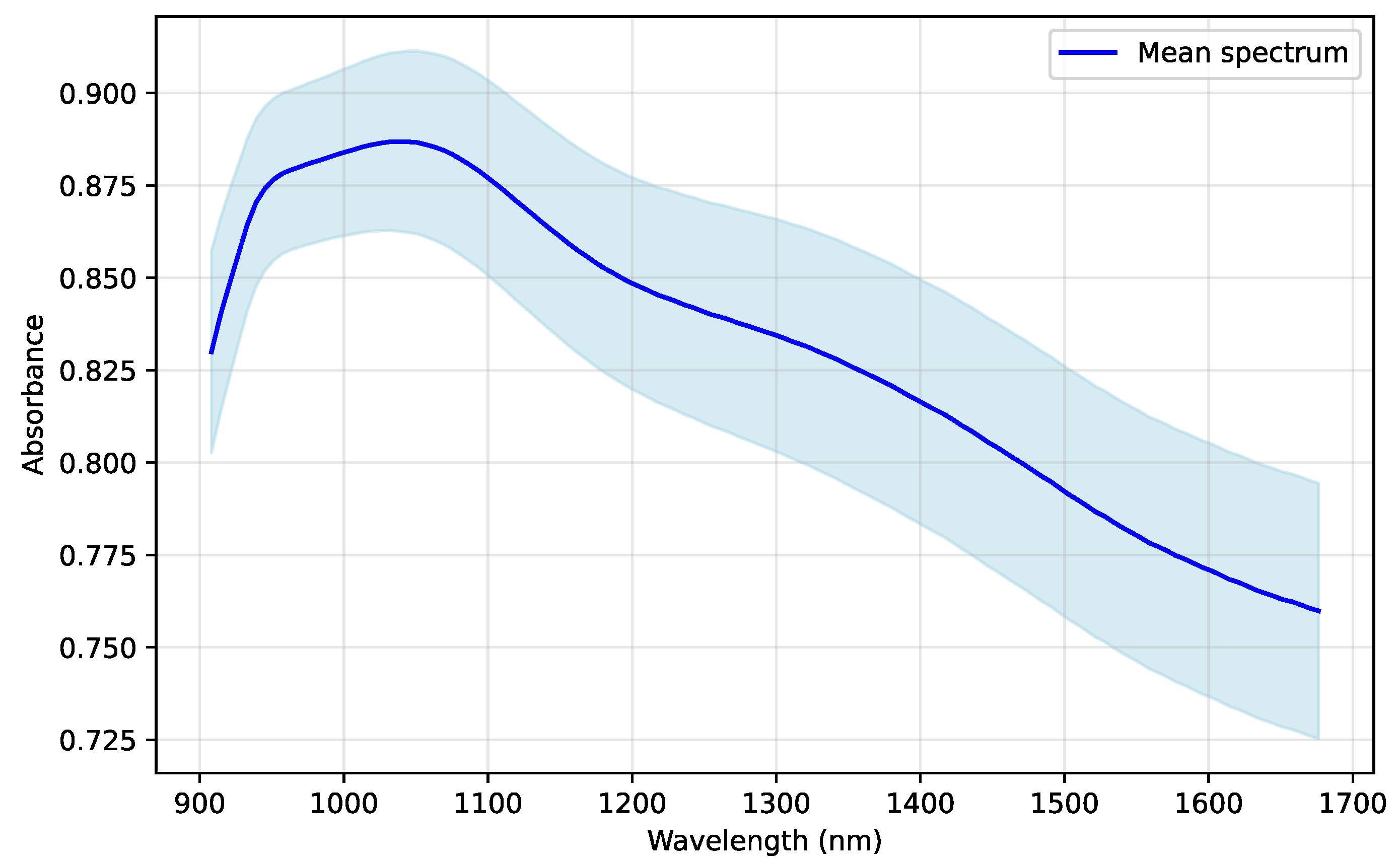 Figure 3 illustrates the mean and standard deviation of the collected NIR spectra. The solid curve denotes the mean absorbance and the shaded region indicates one standard deviation. The results show that absorbance remains relatively stable across the spectral range, with mean values between 0.83 and 0.88.