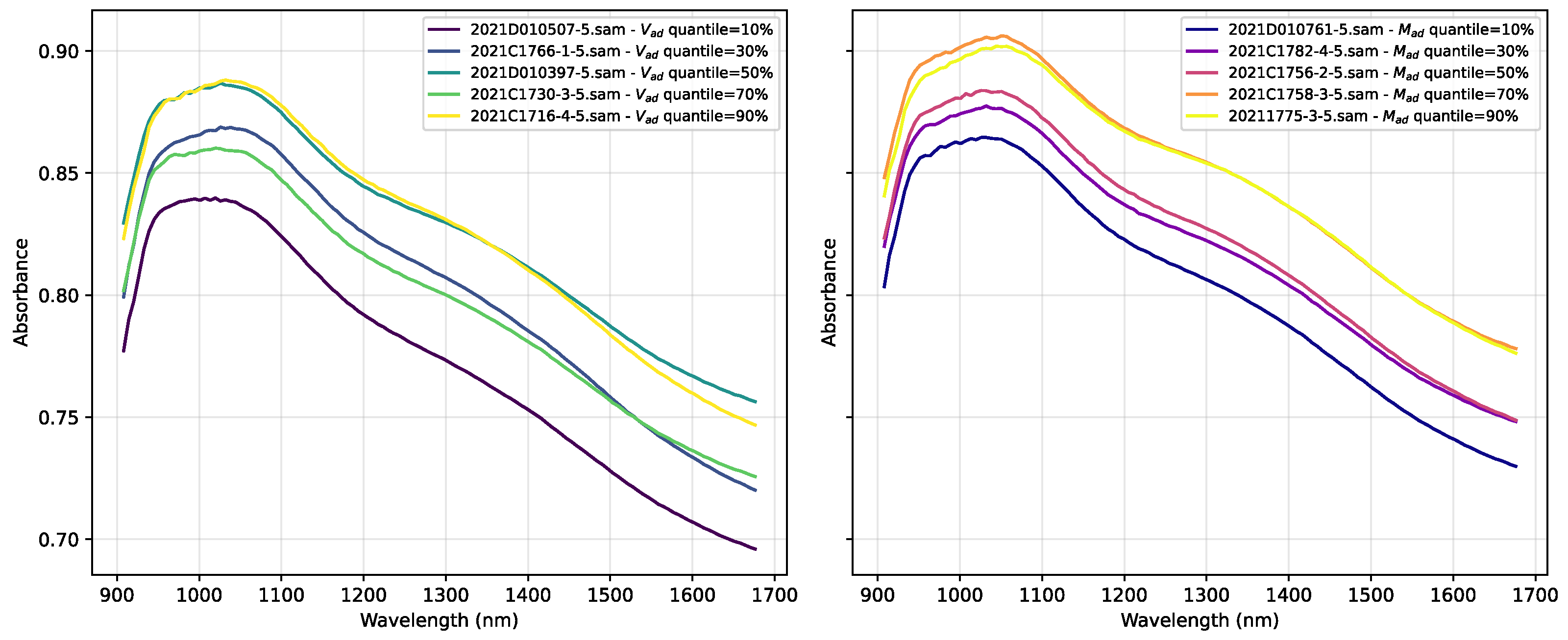. Specifically, samples corresponding to the 10%, 30%, 50%, 70%, and 90% quantiles of each property were chosen. The NIR spectra for these representative samples are plotted in