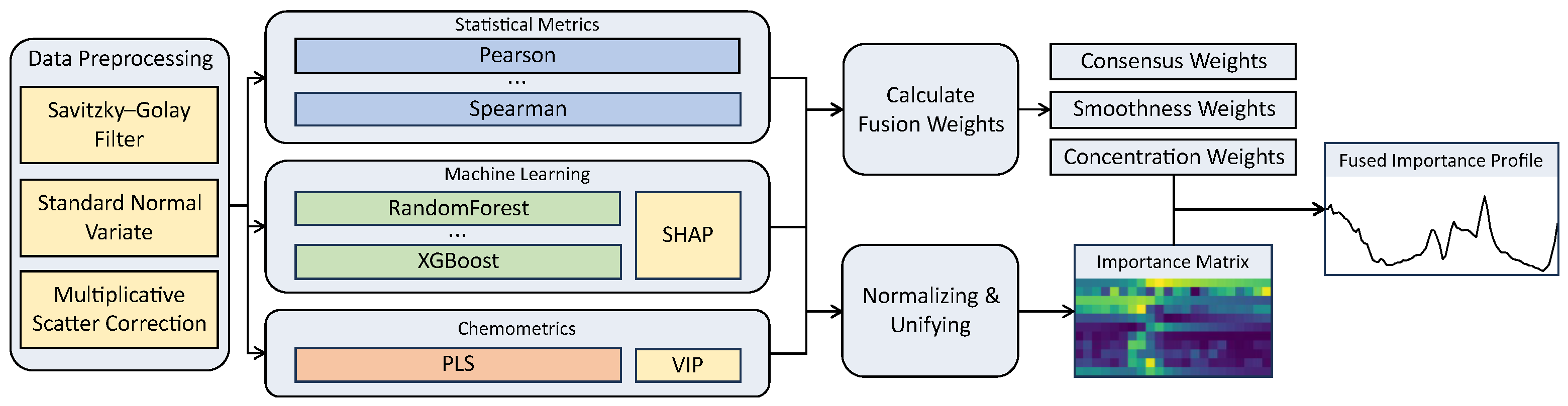 Figure 5. The framework operates in two main stages. First, a parallel single-modality analysis is performed, where a diverse set of methods independently generates importance profiles from the preprocessed spectral data. Second, a multi-method integration stage adaptively fuses these individual profiles. The fusion process is guided by three quantitative metrics: inter-method consistency, smoothness, and local concentration. These metrics determine the final weight assigned to each method, and the final output is a single, robust feature importance profile created through a weighted aggregation.