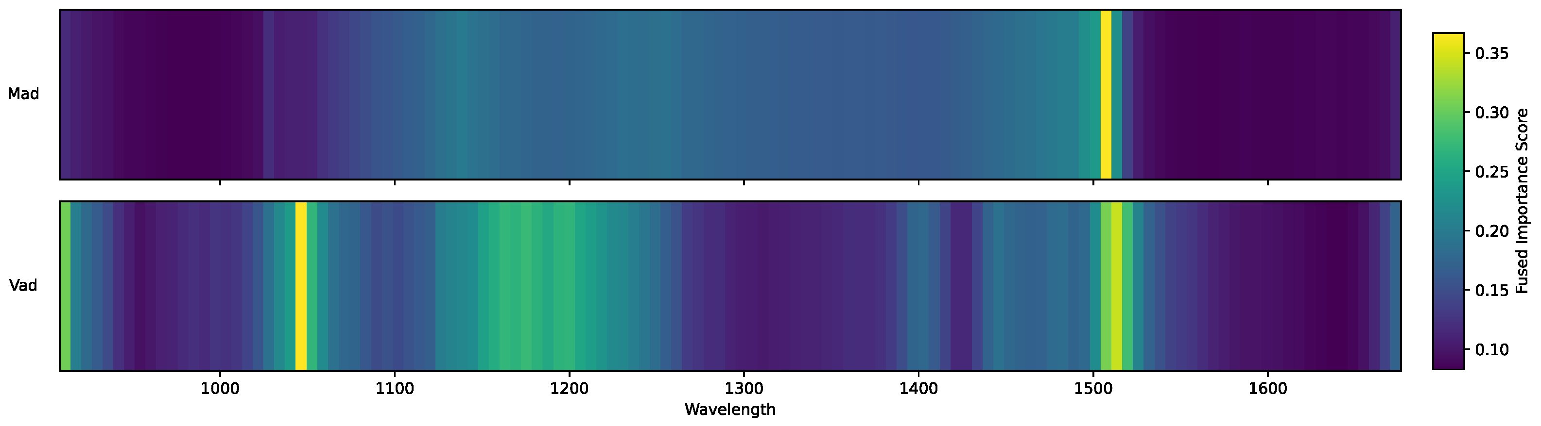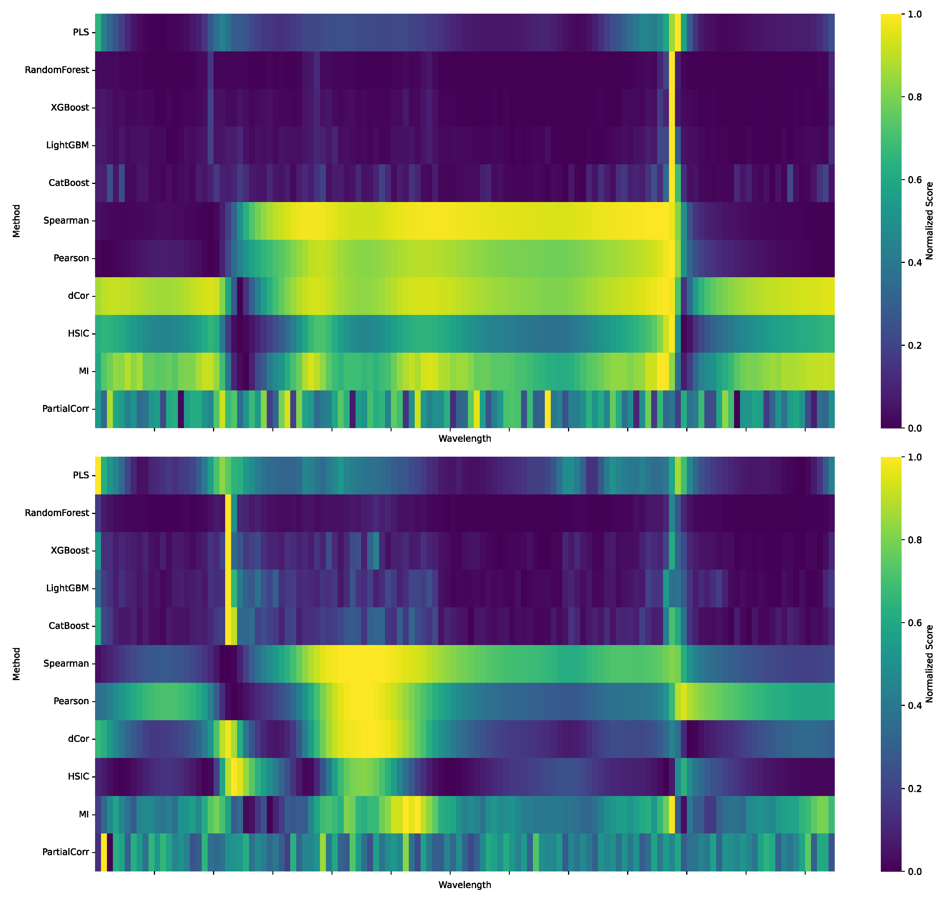 Figure 6 presents the comparative wavelength importance rankings from the eleven feature selection methods. To ensure a fair comparison, all results were normalized. The resulting heatmaps reveal distinct patterns for both