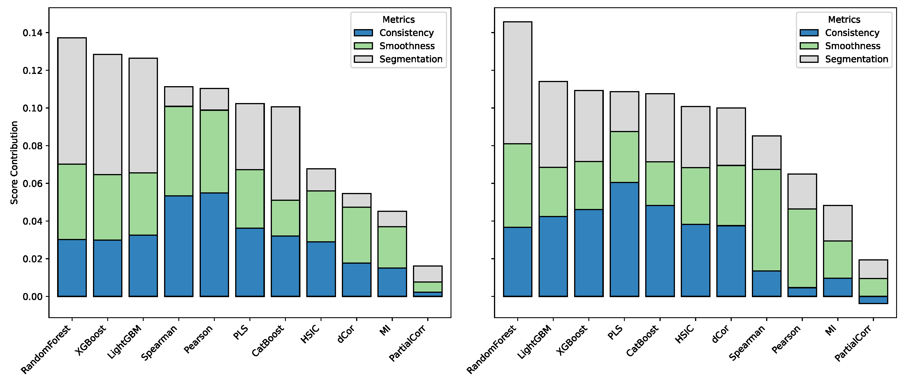 Figure 6, where statistical approaches emphasize continuous trends across broader regions, while machine learning models capture sharp, localized features. Moreover, Random Forest stands out by obtaining the highest scores simultaneously in both the smoothness and concentration metrics, reflecting its strong capacity to balance broad signal capture with local feature discrimination. By contrast, Partial Correlation (PCor) yields the lowest overall scores across both