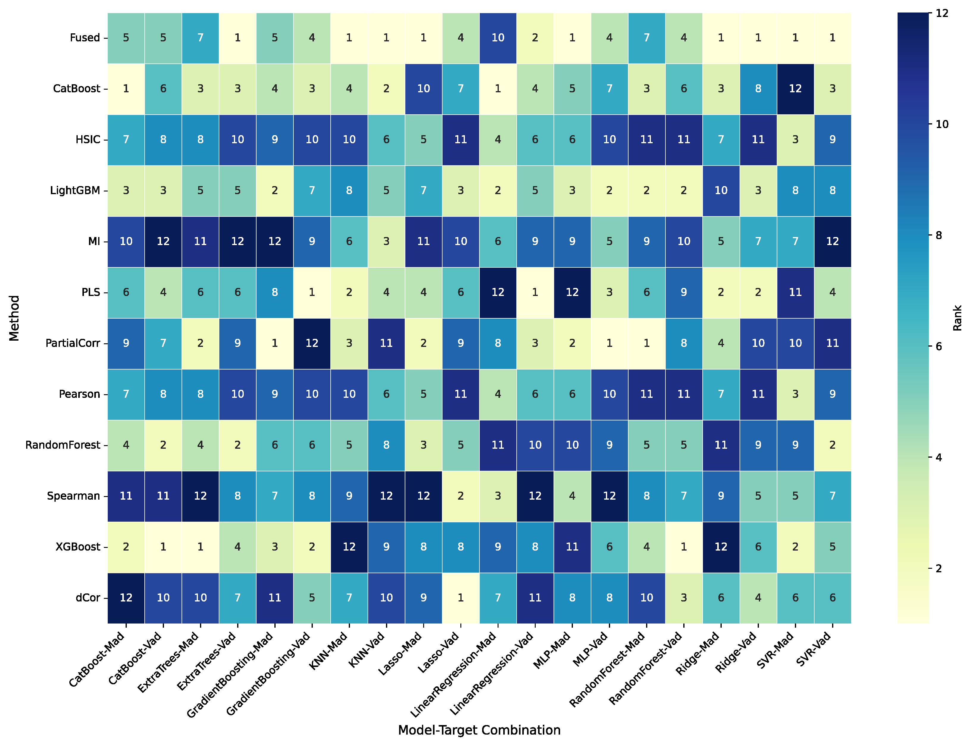 Figure 9). The heatmap visually confirms that the fused method not only secured the top rank most frequently but also demonstrated exceptional robustness, as its performance ranking never dropped below tenth place in any scenario. This stability is a key advantage, demonstrating that our fusion strategy avoids drastic performance degradation and maintains balanced effectiveness across heterogeneous modeling scenarios. This overall success stems from the method’s ability to synthesize complementary analytical strengths, integrating the stable, global trends from statistical methods with the sharp, localized power of machine learning models to create a more universally effective feature set.