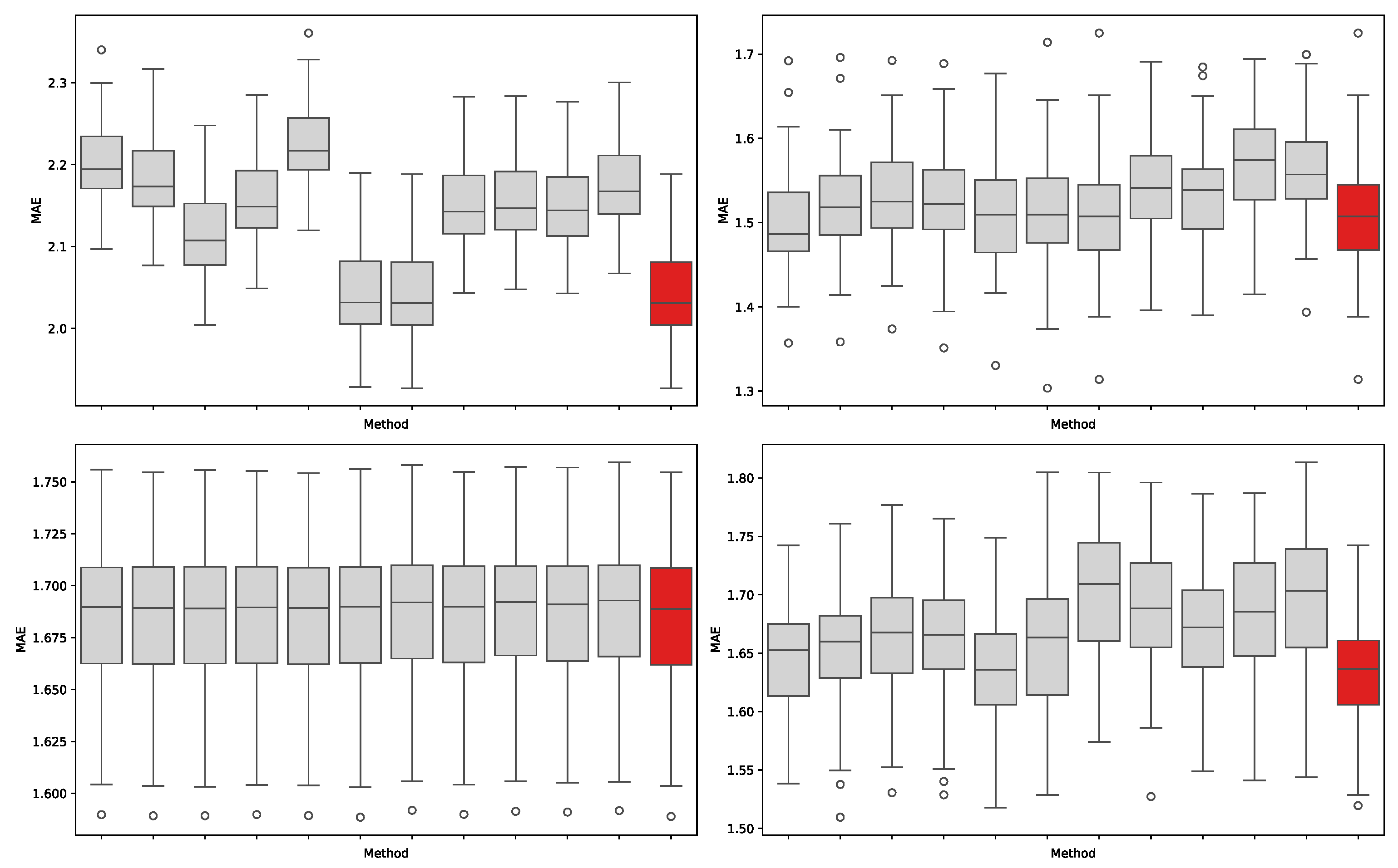 15], Ridge, SVR, and MLP, with the Mean Absolute Error (MAE) adopted as the primary evaluation metric. Specifically, for each feature selection strategy, the prediction errors were averaged over top-N subsets, where N was set to representative values from 50 to 70 at an interval of 5 for both the