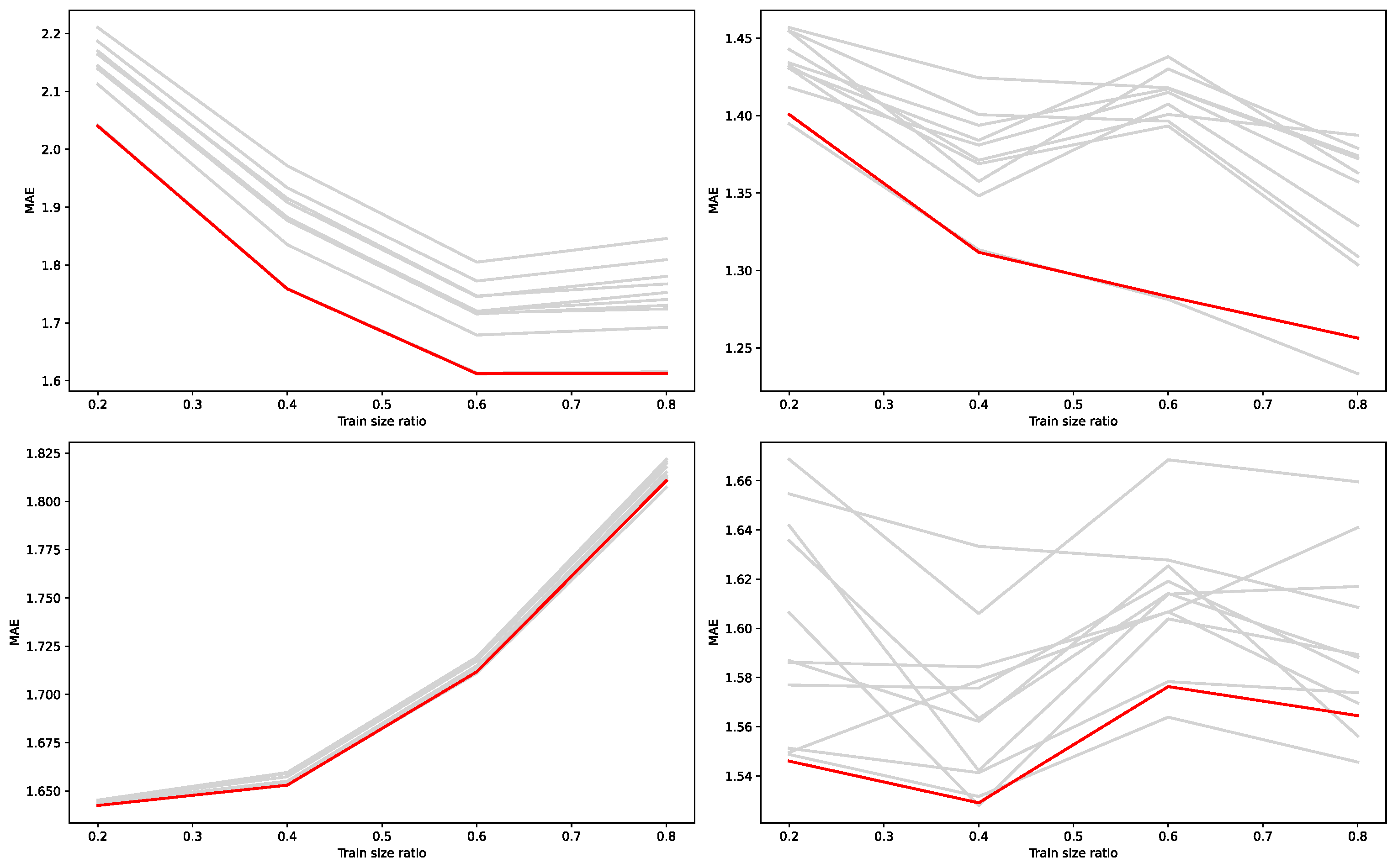 In order to further investigate the effect of training set size on model performance, we evaluated MAE across different train–test ratios for both