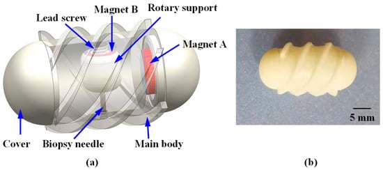 Figure 1 illustrates the motion of the robot within the intestine containing a lesion, where it reaches the target position to perform a biopsy. To achieve this function, the proposed system consists of the MCCR-IB and a magnetic field generation system for controlling the MCCR-IB. The magnetic field generation system is located outside the human body and produces the required magnetic field to control the MCCR-IB inside the body. The structural design of the MCCR-IB is shown in Figure 2a. The MCCR-IB contains two permanent magnets: Magnet A, used for locomotion, actuates the robot inside the intestine; and Magnet B, used for biopsy, controls the biopsy mechanism to perform tissue sampling. Magnet A is rigidly connected to the main body, with its magnetization oriented radially. The outer surface of the main body is equipped with helical threads, enabling the robot to move forward or backward. Both ends of the main body are sealed with two covers. Magnet B is fixed to a rotary support, which can rotate around a lead screw to generate linear motion. A biopsy needle is mounted on the rotary support. The linear motion of the rotary support drives the biopsy needle to extend from the main body to collect intestinal tissue. After sampling, the rotary support reverses its rotation, retracting the biopsy needle back into the main body. In this study, the MCCR-IB was fabricated using 3D printing, as shown in Figure 2b. The overall dimensions of the MCCR-IB are 14 mm in diameter and 29 mm in length.