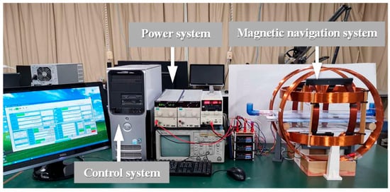 To generate the desired magnetic field, a magnetic field generation system was developed, as illustrated in Figure 3. The system consists of three main components: a control system, a power system, and a magnetic navigation system. The control system produces command signals, which are transmitted through the power system to drive the magnetic navigation system. This process generates the corresponding magnetic fields required to control the MCCR-IB. The magnetic navigation system comprises six coils, arranged in three orthogonal pairs, each capable of producing a magnetic field along one of the x, y, and z axes.