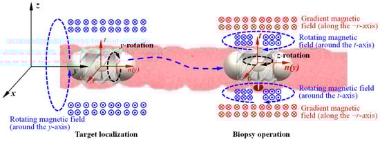 The biopsy operation using the MCCR-IB within the intestine involves two types of motion: target localization and biopsy operation. During target localization, the robot moves forward or backward inside the intestine to reach the desired target position. As illustrated in Figure 4, an external rotating magnetic field is applied around the y-axis. Under this rotating field, the MCCR-IB moves toward the target position and eventually reaches it. In this process, Magnet A rotates in response to the applied magnetic field, providing the locomotion of the robot, while Magnet B experiences only a minor magnetic torque, resulting in slight oscillation. The detailed mechanics analysis and discussion are presented in Section 2.3.