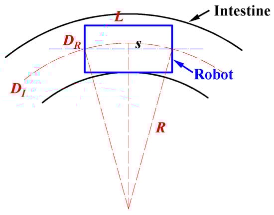 Analysis of the robot’s maneuverability in curved intestinal segments. In the diagram, is the robot diameter, means the robot length, indicates the intestinal inner diameter, and is the curvature radius of the intestine.