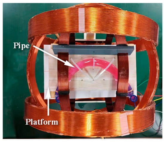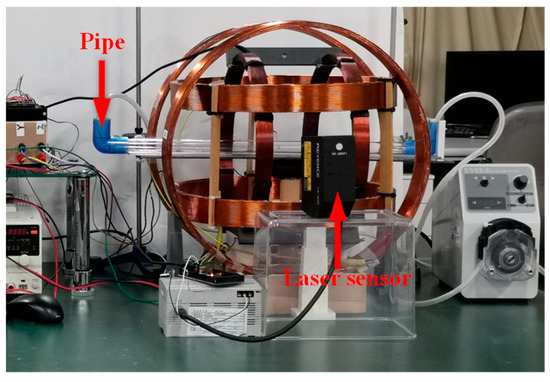 To evaluate the locomotion feasibility of the MCCR-IB under magnetic actuation, a series of locomotion experiments were conducted. The experimental setup is illustrated in Figure 6. A pipe with an inner diameter of 31 mm was placed inside the magnetic navigation system to serve as the motion channel for the robot. To measure the robot’s translational velocity, a laser displacement sensor (LK-500, KEYENCE, Osaka, Japan) was positioned alongside the magnetic navigation system. The control system generated command signals to produce a rotating magnetic field along the pipe’s longitudinal axis. The magnetic field frequency was increased from 0 to 10 Hz in 1 Hz increments. The robot was driven forward under each frequency condition, and its velocity was recorded using the laser displacement sensor. Each test was repeated three times for averaging. Subsequently, the rotation direction of the magnetic field was reversed to drive the robot backward, and the backward velocity was measured in the same manner.