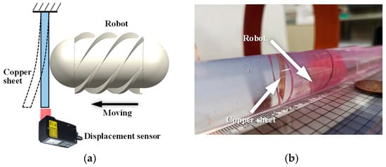 In addition, the propulsion force of the robot was experimentally evaluated. The setup is shown in Figure 7. For convenience of measurement, a copper sheet was fixed inside the pipe. During locomotion, the robot pushed the copper sheet, causing measurable deformation. The copper sheet was modeled as a cantilever beam, and the propulsion force of the robot was calculated based on the deformation of the beam. Both forward and backward motions were tested three times, respectively.