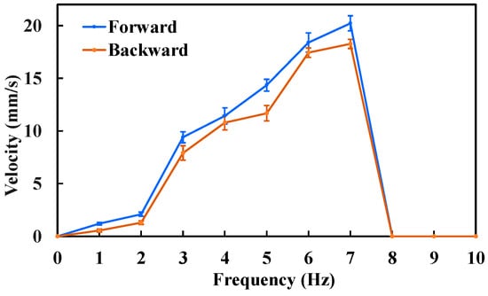 The forward and backward velocities of the MCCR-IB under different magnetic field frequencies are shown in Figure 8. As observed, the robot’s locomotion speed increases with the magnetic field frequency. This trend occurs because a higher rotating magnetic field frequency induces a faster rotation of the robot, thereby generating a higher translational velocity. The proposed MCCR-IB achieved a maximum forward velocity of 20.22 mm/s and a maximum backward velocity of 18.27 mm/s. It was also observed that when the magnetic field frequency exceeded 7 Hz, both the forward and backward velocities dropped to zero. During locomotion, the robot’s rotation follows the external magnetic field with a certain phase lag. As the magnetic field frequency increases, this phase difference also increases. When the phase difference exceeds a critical threshold, the magnetic torque acting on the robot decreases sharply, preventing further rotation.