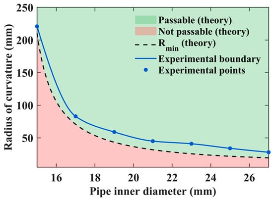 To visualize this capability more intuitively, we conducted theoretical calculations by varying both the inner diameter and the curvature radius of the pipe. According to the National Cancer Institute (NCI) [], the small intestine is a tube measuring about 25 mm in diameter. The proposed robot has a length of 29 mm, and thus, we set the pipe’s inner diameter range to 15–27 mm. Regarding the curvature radius, to the best of our knowledge, no clinical data are currently available. Thus, we conservatively set the initial value to 5 mm and gradually increased it until the robot could pass completely. Since a curvature radius of 5 mm is unrealistically small for the intestine, this conservative assumption provides a meaningful reference. The theoretical relationship was plotted, as shown in Figure 11, where the horizontal and vertical axes represent the pipe’s inner diameter and the curvature radius of the bend, respectively. In the figure, the light green region indicates the passable region, while the light red region corresponds to the non-passable (infeasible) region. The black dashed line represents the theoretical boundary.