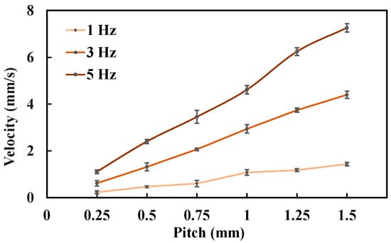 The biopsy puncture velocity under different conditions is shown in Figure 13. As the lead-screw pitch increases, the biopsy needle velocity correspondingly increases. Under a 3 Hz rotating magnetic field, the biopsy needle velocity was 1.32 mm/s when the lead-screw pitch was 0.5 mm, and it increased to 3.74 mm/s when the pitch was 1.25 mm. This occurs because, under the same magnetic field frequency, a larger lead-screw pitch results in a greater linear displacement per revolution of the rotary support. Similarly, the biopsy needle velocity also increases with the rotating magnetic field frequency. For example, when the lead-screw pitch was 1.0 mm, the biopsy needle velocity increased from 1.08 mm/s at 1 Hz to 4.61 mm/s at 5 Hz. A higher magnetic field frequency drives the rotary support to rotate faster, thereby generating greater linear displacement of the biopsy needle.