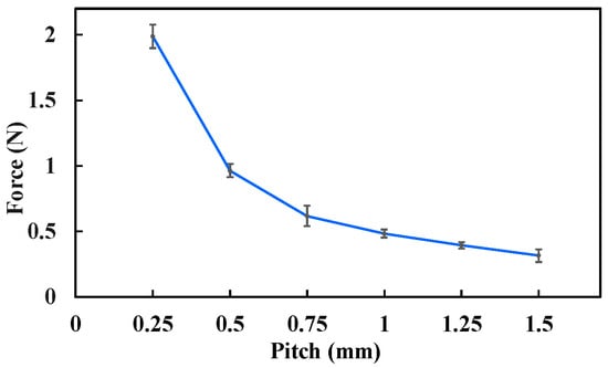 The measured biopsy puncture forces under different conditions are presented in Figure 14. The results show that the puncture force decreases as the lead-screw pitch increases. Specifically, when the pitch was 0.5 mm, the puncture force was 0.96 N; when the pitch increased to 1.5 mm, the puncture force decreased to 0.32 N. This reduction occurs because a larger lead-screw pitch corresponds to a larger lead angle, which reduces the axial component of the transmitted force, resulting in a smaller puncture force.