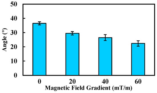 The deviation angle of the MCCR-IB under different gradient magnetic fields is shown in Figure 15. As the magnetic field gradient increased from 0 mT/m to 60 mT/m, the deviation angle decreased markedly from 36.5° to 22.4°. A clear reduction in deviation amplitude was observed with increasing gradient strength. In addition, a stronger gradient field would further reduce the oscillation. These results demonstrate the feasibility and effectiveness of the proposed method.