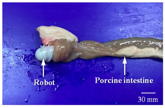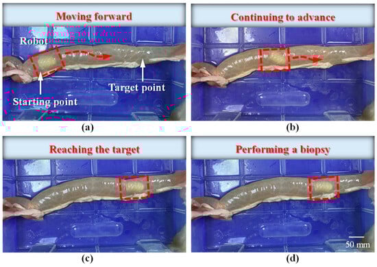 As shown in Figure 16, the MCCR-IB was inserted from one end of the porcine intestine, and water was injected into the lumen to maintain a hydrated environment. As illustrated in Figure 17, two positions were defined within the intestine: a starting position and a target position. The robot began locomotion from the starting position and moved forward along the intestinal lumen. Upon reaching the target position, the robot stopped and performed the biopsy operation. The entire locomotion and biopsy process were recorded, and after completion, the tip of the biopsy needle was examined to confirm whether intestinal tissue had been successfully collected.
