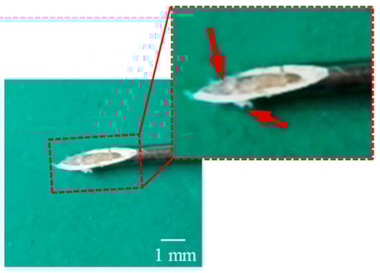 The locomotion process of the MCCR-IB inside the porcine intestine is illustrated in Figure 17. In Figure 17a, the MCCR-IB begins locomotion from the starting position. In Figure 17b, it moves toward the target position through the middle section of the intestine. In Figure 17c, the robot reaches the target position and stops. Finally, in Figure 17d, the MCCR-IB performs the biopsy operation on the intestinal wall. These sequential images clearly demonstrate that the proposed MCCR-IB successfully achieved locomotion and biopsy inside the porcine intestine. Figure 18 shows the tissue sample extracted by the biopsy needle after the biopsy procedure. A visible amount of intestinal tissue adhered to the needle tip, confirming the feasibility of real-time intestinal biopsy using the proposed MCCR-IB.