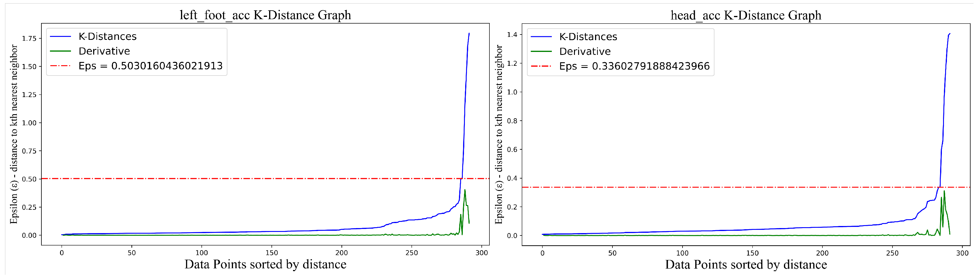 48] for anomaly detection within individual keypoint acceleration series due to its unsupervised nature, its ability to identify outliers without pre-specifying the number of clusters, and its proven efficacy in density-based outlier detection. Since the motion ranges of the keypoints vary significantly across different actions, using a fixed neighborhood radius could result in suboptimal clustering. Thus, we dynamically determine the DBSCAN parameter