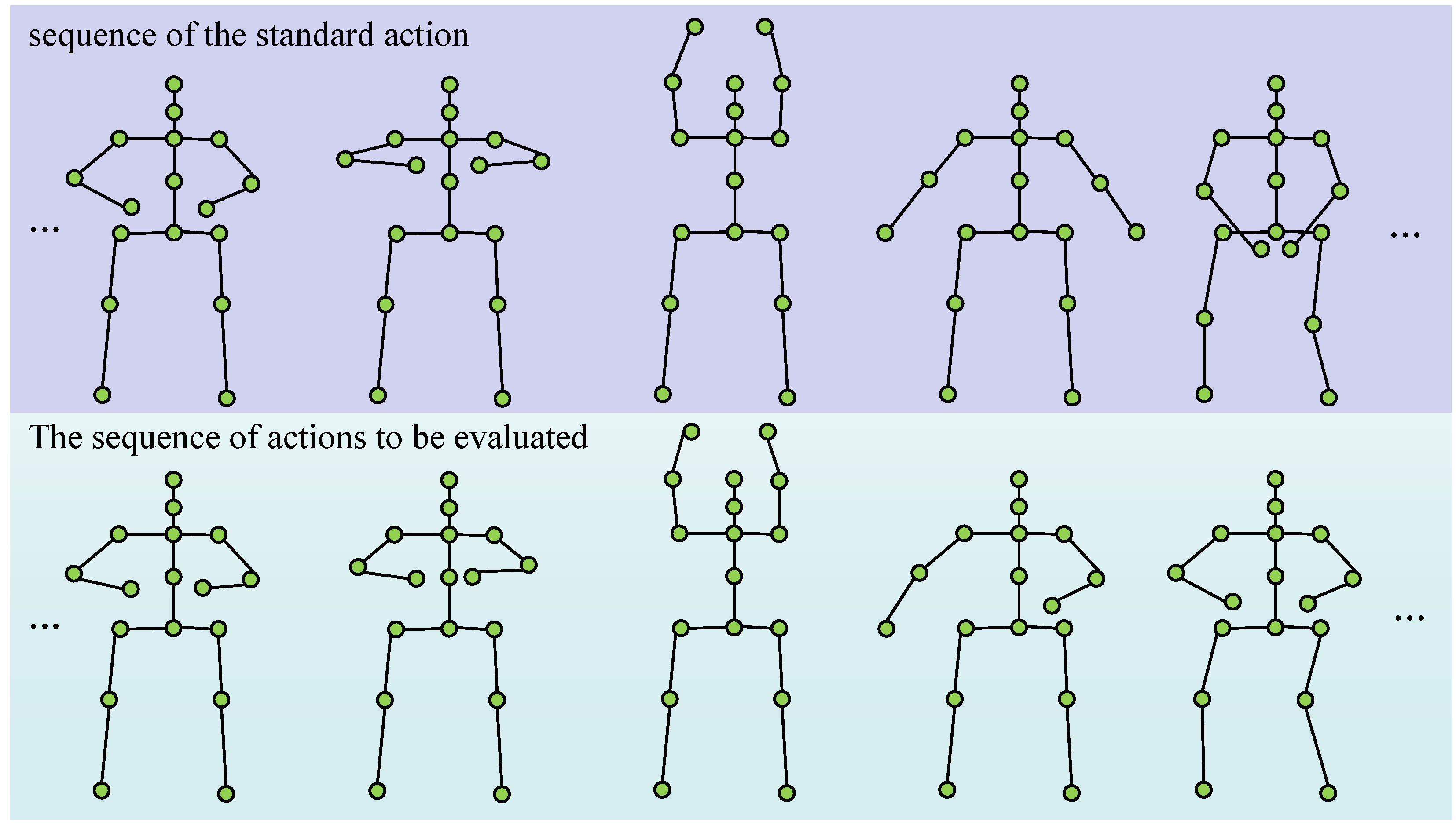 Finally, by combining limb angles, body orientation, and shoulder-hip joint angles, we obtain a total of 27-dimensional limb motion angle features: F = [ … , … , … , … , … ]. These features provide comprehensive input data for subsequent action similarity calculations and action scoring methods. To further optimize the efficiency of AQA, we designed a fast action quality scoring algorithm QAQA to address performance bottlenecks in long-sequence calculations.