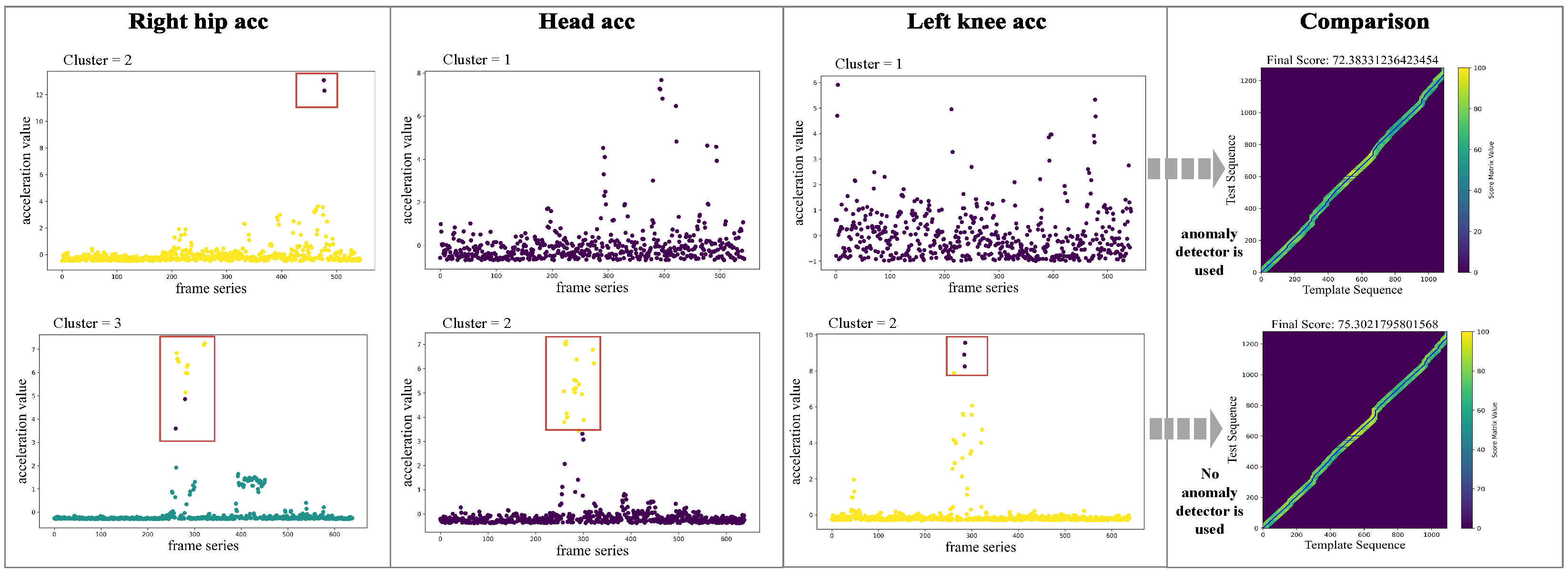 The processing flow of the anomaly detection module consists of three primary steps: First, extract the acceleration sequence for both the template and the test keypoint data. Second, determine the DBSCAN parameters () and detect outliers in the acceleration sequences. Finally, calculate the threshold coefficient t based on the outliers detected in Step 2.