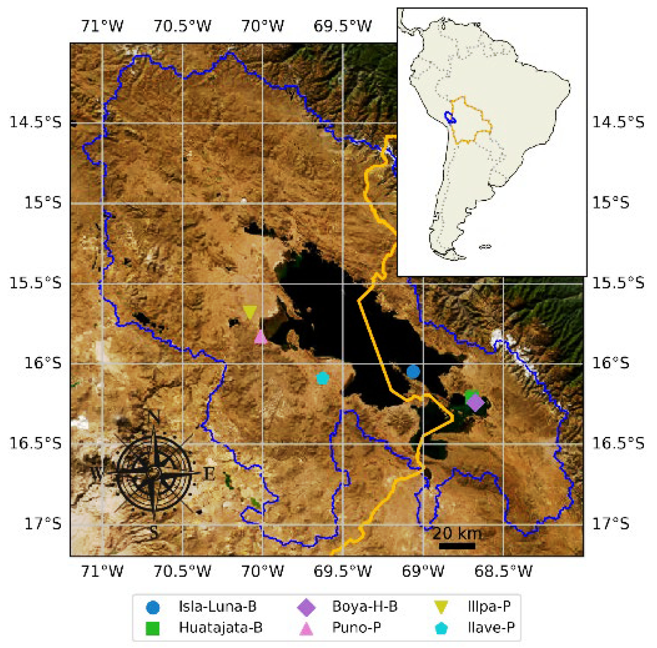 | Huatajata, Bolivia (Huatajata-B) | 68° 41′ 50.81″ W | 16° 12′ 41.09″ S | 3831 | Campbell Scientific CSRAWS, Logan (Utah), USA. Equipped with rain gauge (TE525WS-L) [31], probe for RH/T (CS215) [32], anemometer (A100R) [33], wind vane (W200P) [33], pyranometer (SP1100) [34]. |