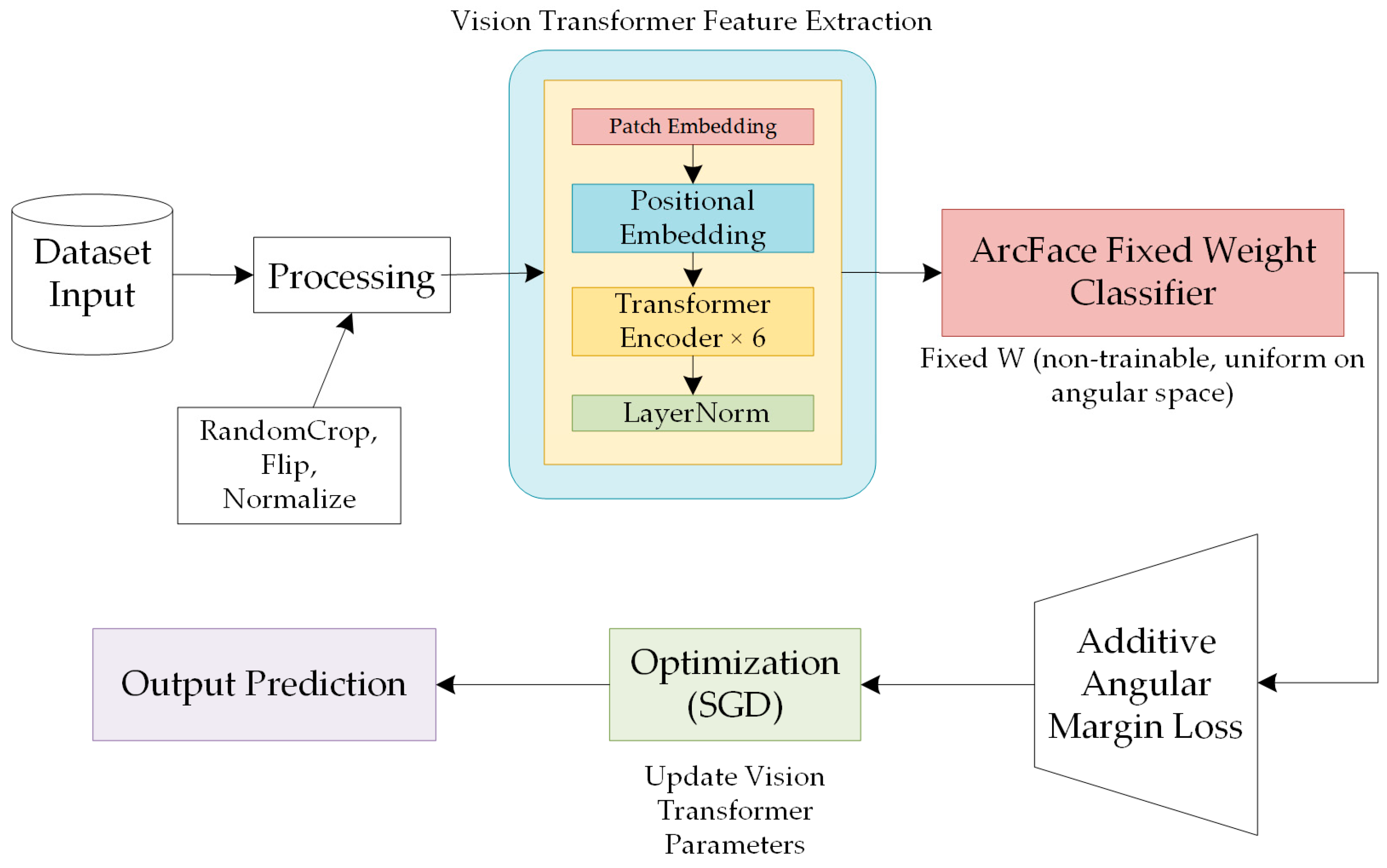 2.4. Proposed Model Based on Advanced Fixed-Weight ArcFace Loss and Vision Transformer