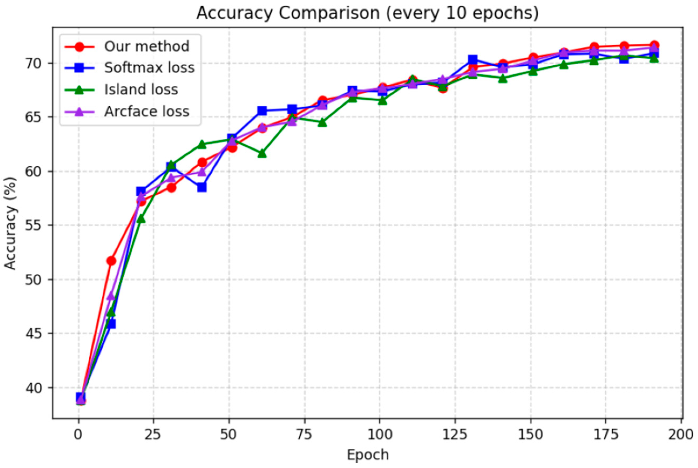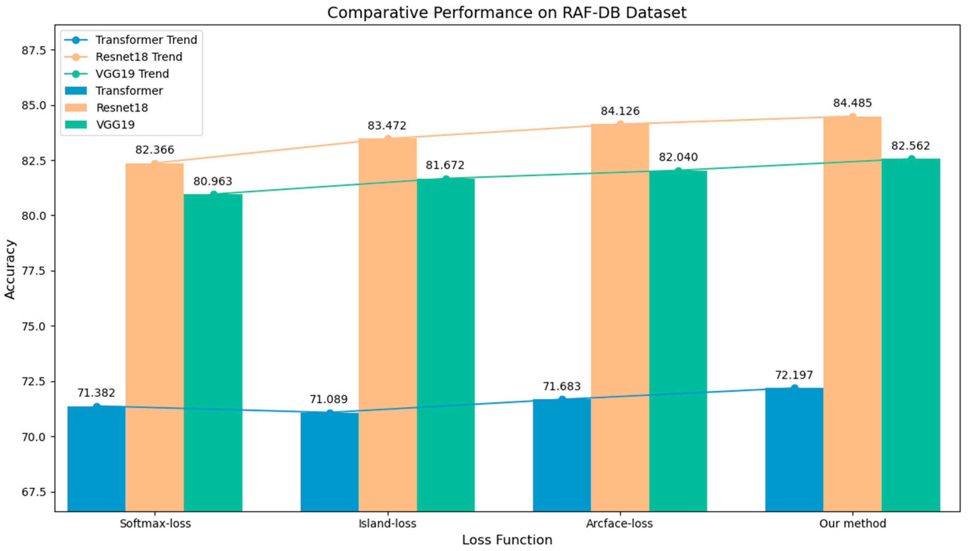 - Under the FER2013 [33] and RAF-DB [34] facial expression databases, the authors conducted experiments using Vision Transformers and traditional convolutional networks to perform feature extraction tasks. The authors systematically compared the proposed method with traditional loss functions and the standard ArcFace loss function, yielding consistent and reliable improvements.