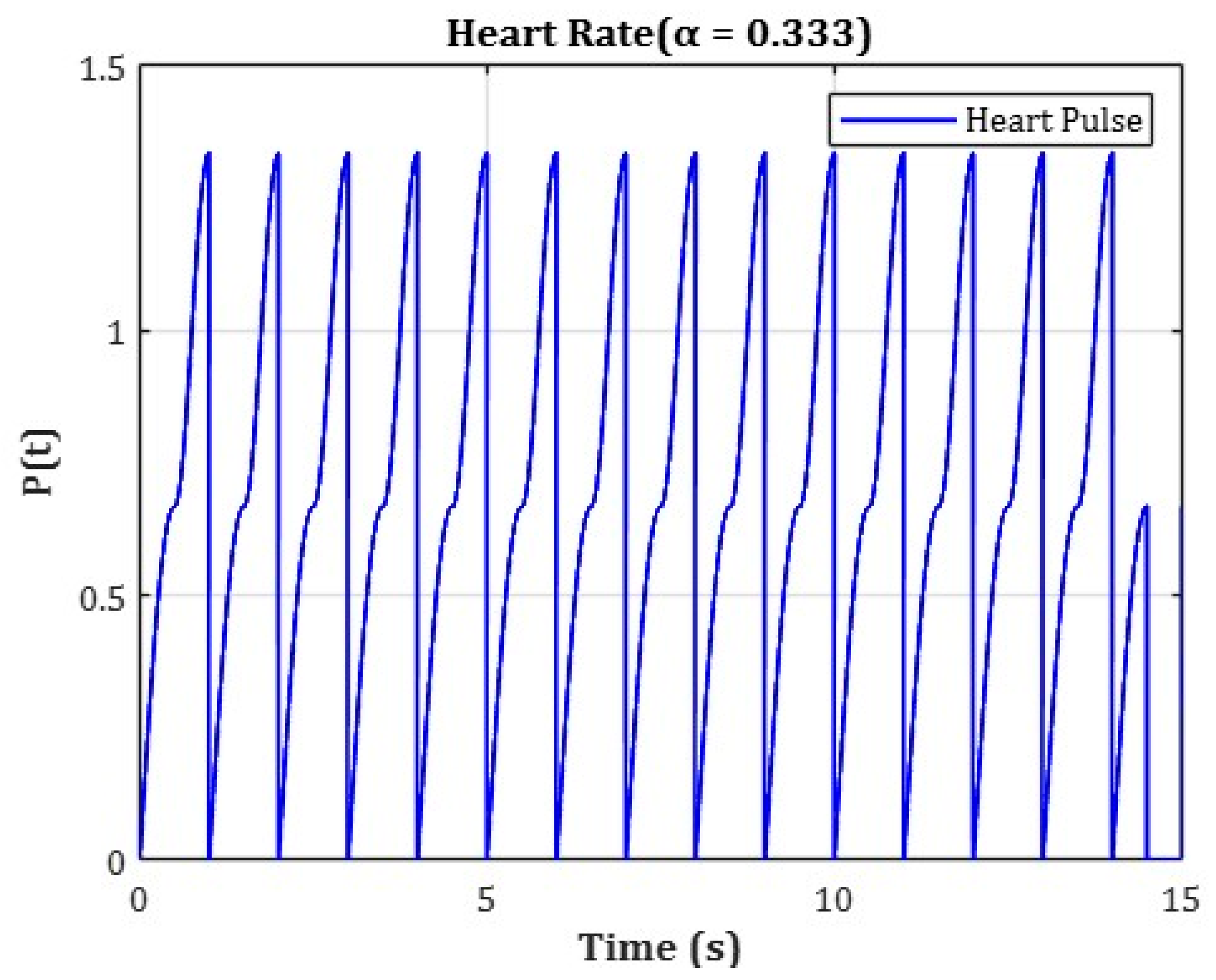 The physiologically relevant cardiac phase was set from 0.5 s to 1.5 s, representing a 1.0 s interval. During this period, the blood pressure was modeled as a periodic oscillation between minimum and maximum values using a triangular waveform function. This function was designed based on the average adult heart rate of approximately 75 beats per minute (bpm), where one cardiac cycle lasts about 0.8 s. To ensure numerical stability, the time window was extended beyond a single heartbeat for simulation purposes. The following function was applied during the main pulsation phase: