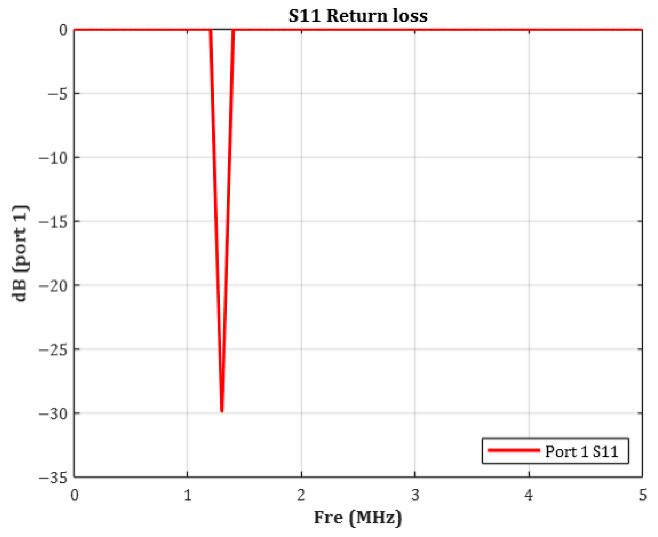 In this study, the resonance frequency of the transmitting coil was set to 1.35 MHz. The return loss simulation confirmed a resonance peak at −29.87 dB, indicating excellent impedance matching at the transmitter and minimal power reflection at the target frequency.
