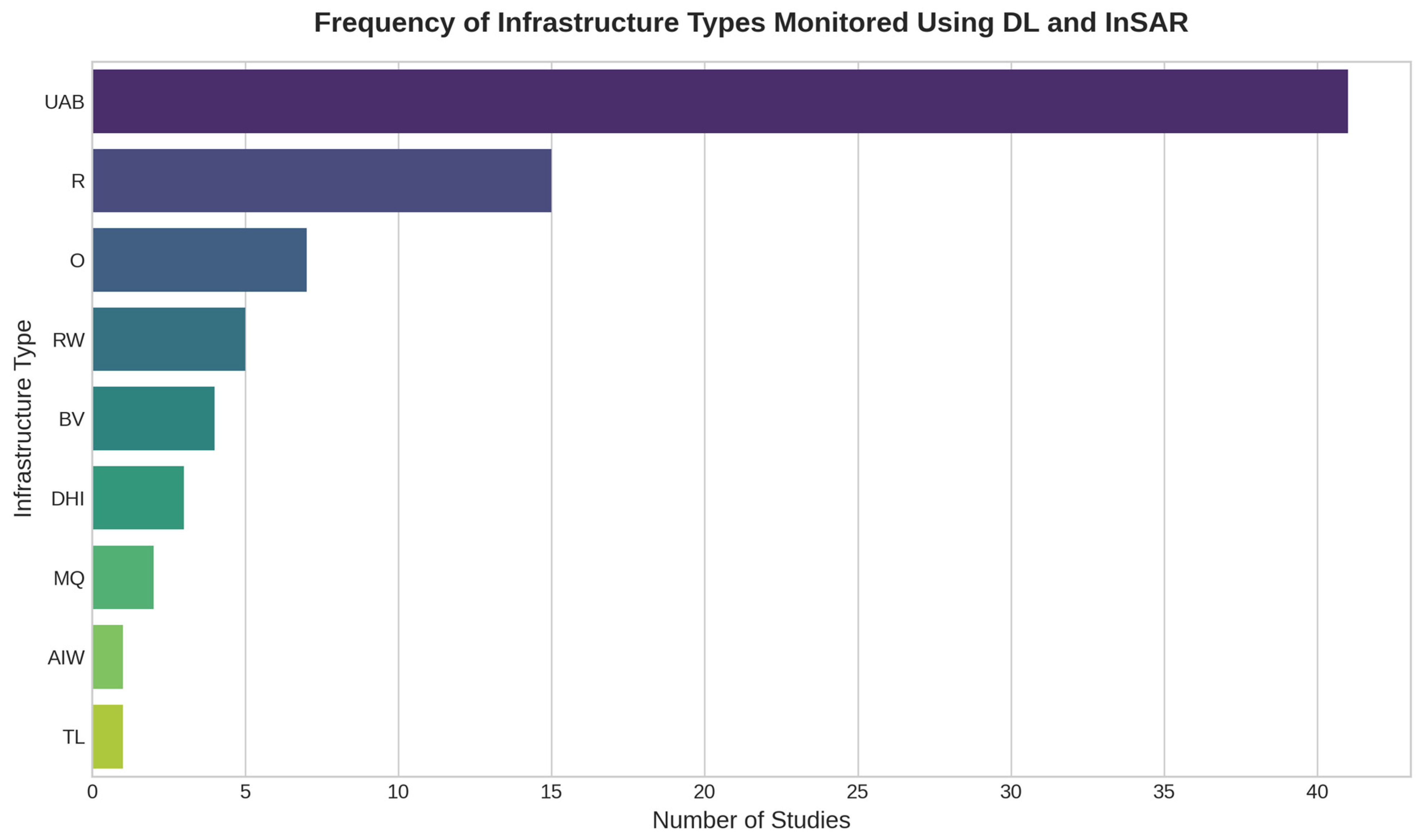 | RQ3: What types of infrastructure have been most frequently monitored? | A strong thematic imbalance exists, favoring territorial-scale applications (urban areas, landslides) over structural-scale ones (bridges, dams). This imbalance is intrinsically linked to physical InSAR limitations (e.g., thermal decorrelation exceeding limit in structural monitoring [95]), which most current DL analysis approaches fail to address, hindering generalization. | [28,36,52,54,55,90] |