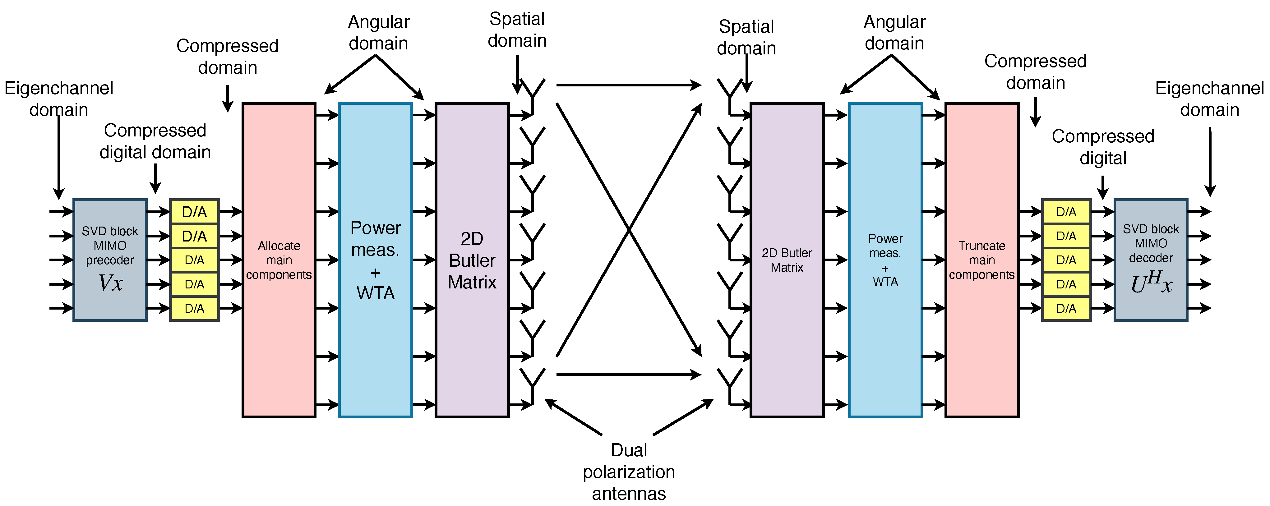 At the BS side, the two-dimensional Butler matrix implements an approximate unitary transform from the antenna domain to a set of orthogonal or quasi-orthogonal angular beams. In the single-user case, a small subset of these beams is selected to concentrate the channel energy and reduce the number of active RF chains. In the MU-MIMO case, the same beamspace representation can be used as the basis for spatial division multiple access: different users are associated with different angular beams (or groups of beams), and low-dimensional digital precoding is carried out across the selected beams to manage inter-user interference.