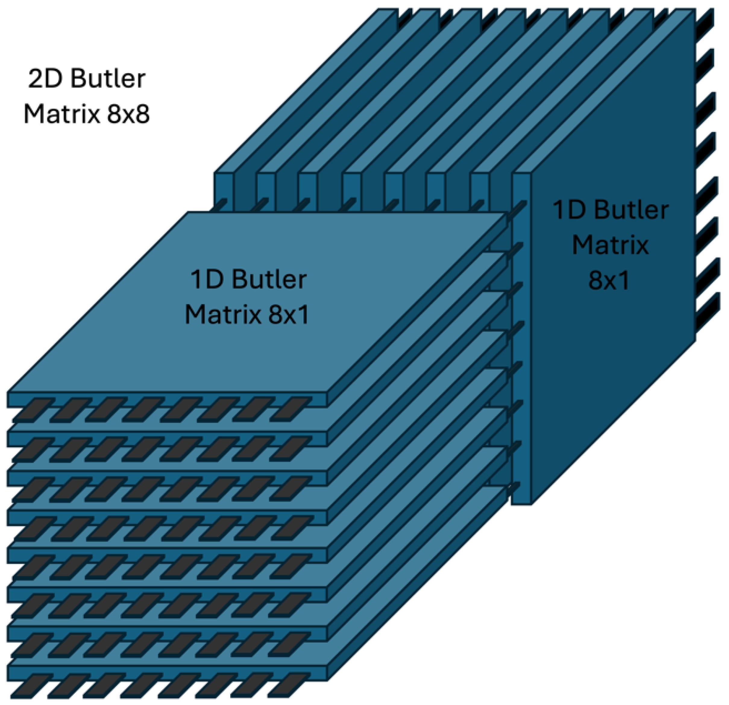 A two-dimensional (2D) Butler matrix for a uniform planar array is obtained by cascading 1D Butler stages along rows and columns, yielding a separable (Kronecker) realization of the 2D Fourier transform. The concept is sketched in
