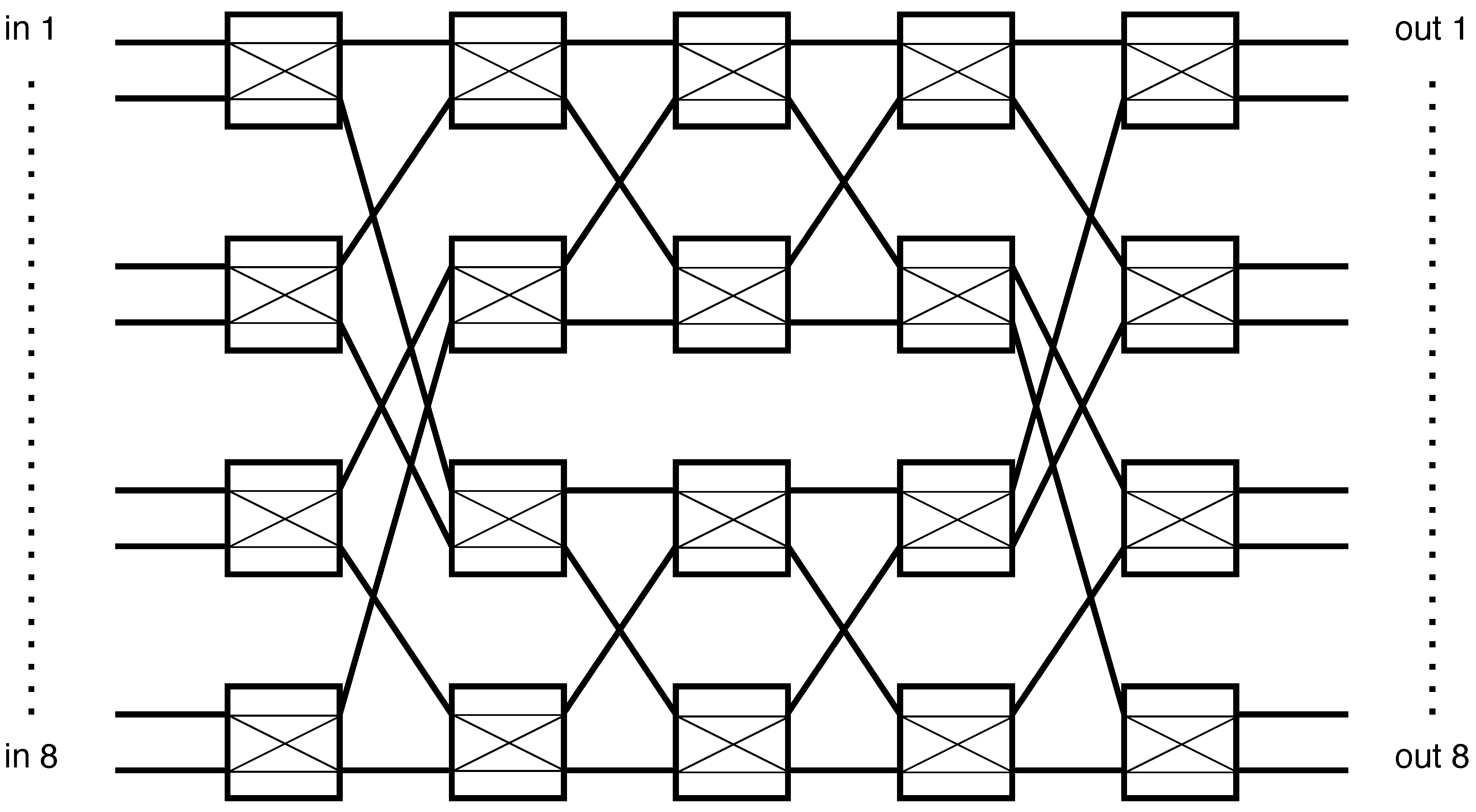 The circuit is built from interconnected hybrid couplers, which split and combine signals with precise amplitude and phase relationships, and fixed phase shifters, which impose additional or shifts along specific paths. Together, these elements generate a set of orthogonal phase progressions across the outputs, effectively realizing a discrete Fourier transform in hardware.