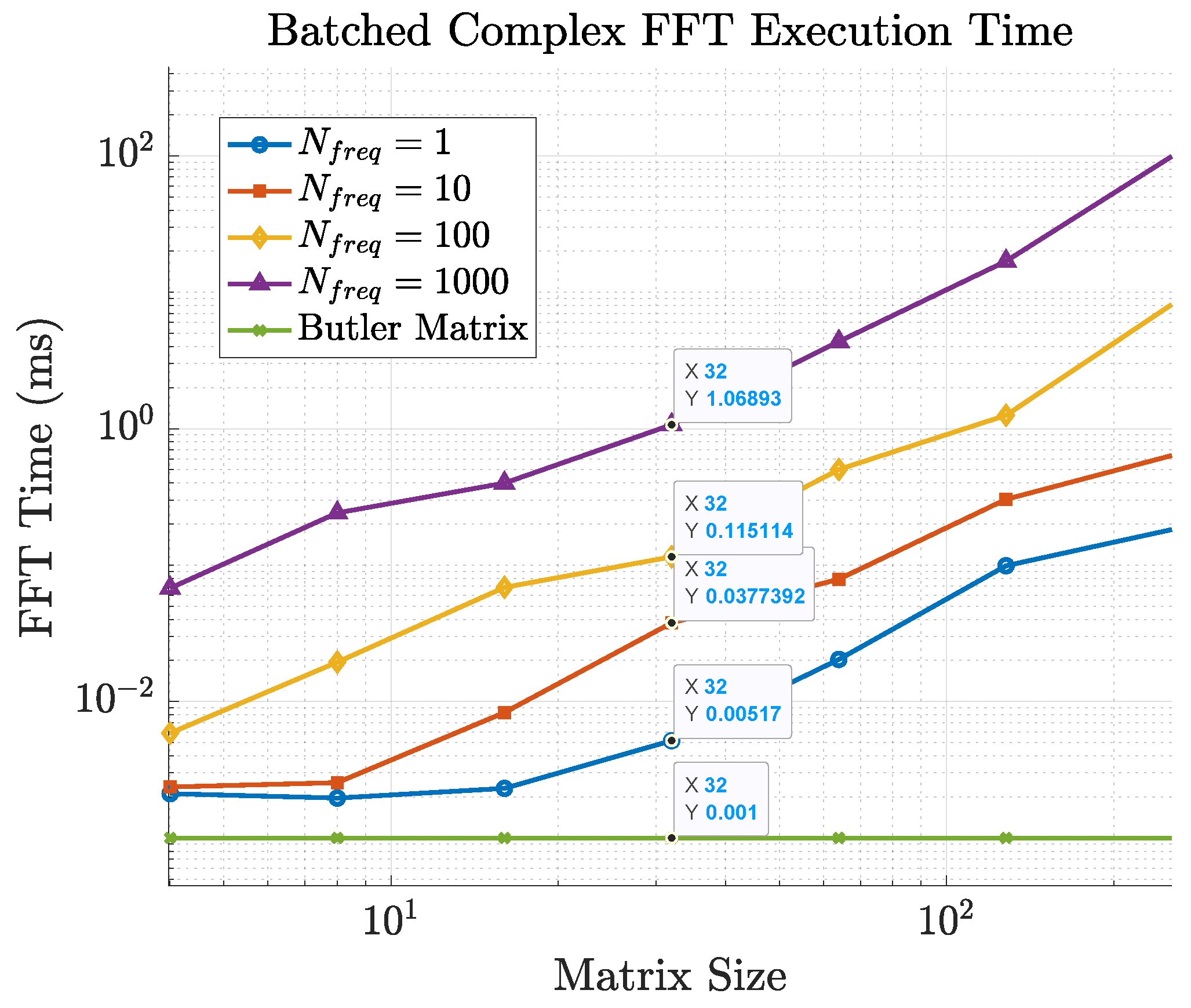 In this paper, we extend that analysis by comparing the FFT-based method with the proposed Butler matrix implementation, in order to assess their relative performance and quantify the benefits of reducing computational complexity.