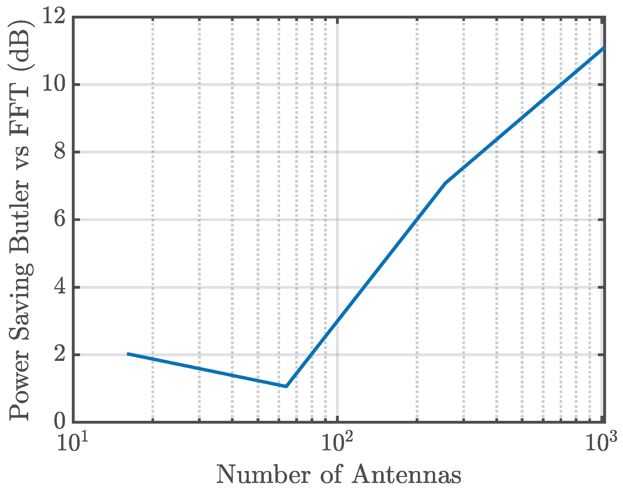 This distinction suggests that the Butler-based scheme offers even greater energy-efficiency advantages when system-level digital signal processing (DSP) power is included in the analysis. In practice, for very large arrays, the DSP burden of FFT operations can dominate the overall power budget, making the analog Butler matrix particularly attractive for energy-constrained or large-scale deployments.