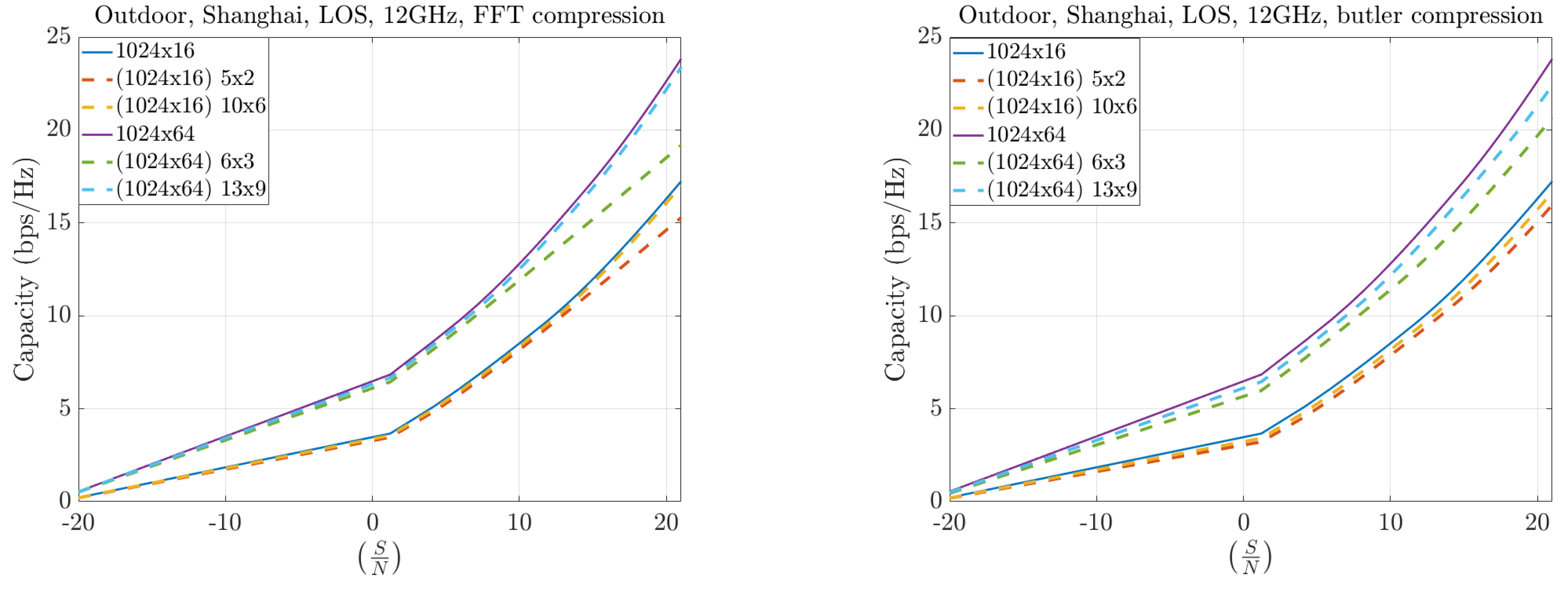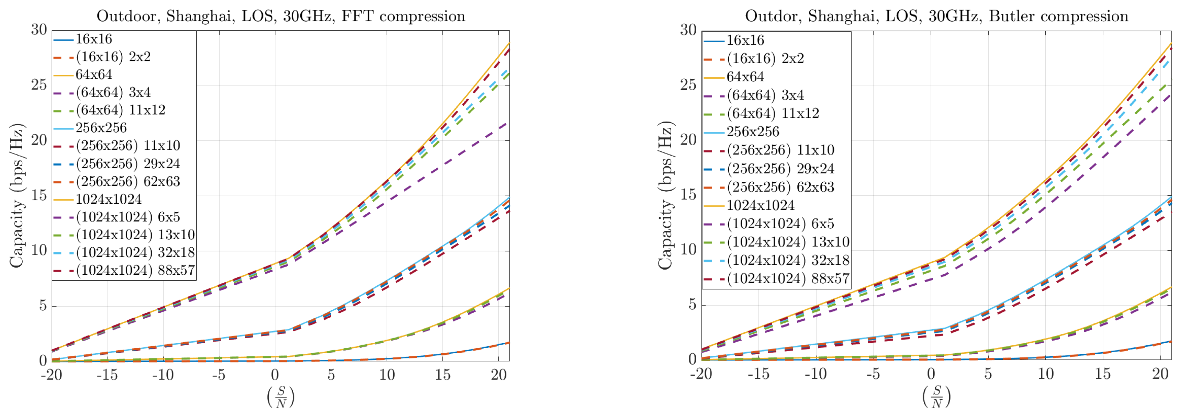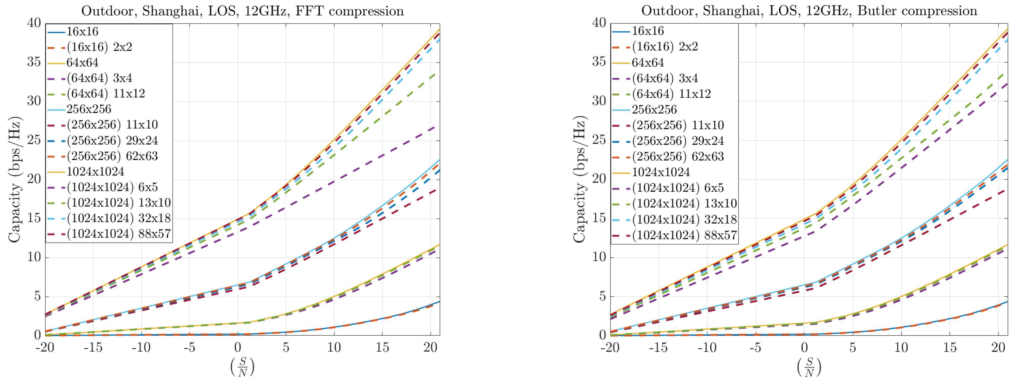 Figure 18 present results for symmetric MIMO array configurations at 12 and 30 GHz, respectively, across different compression levels. The solid curves represent the full Singular Value Decomposition (SVD) decomposition, which serves as the theoretical upper bound. The dashed curves correspond to the practical throughput obtained with compression: the left plots show the FFT-based method, while the right plots show the Butler matrix solution. The results indicate only marginal differences between the two methods, both of which remain close to the theoretical bound. Furthermore, as the compression level increases, both approaches converge toward the ideal capacity, particularly for larger arrays.