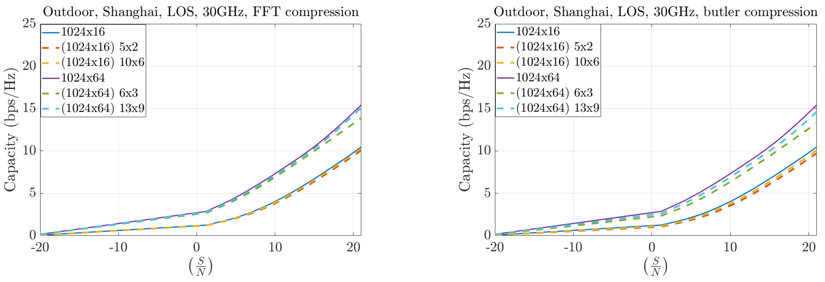 Figure 20 illustrate the case of asymmetric configurations, where the number of antennas at the base station (BS) greatly exceeds that at the user equipment (UE). In these scenarios, the compression performance remains highly similar between the FFT and Butler matrix approaches. The throughput differences become more pronounced at higher frequencies (30 GHz compared to 12 GHz), reflecting the increased channel sparsity at millimeter-wave bands.