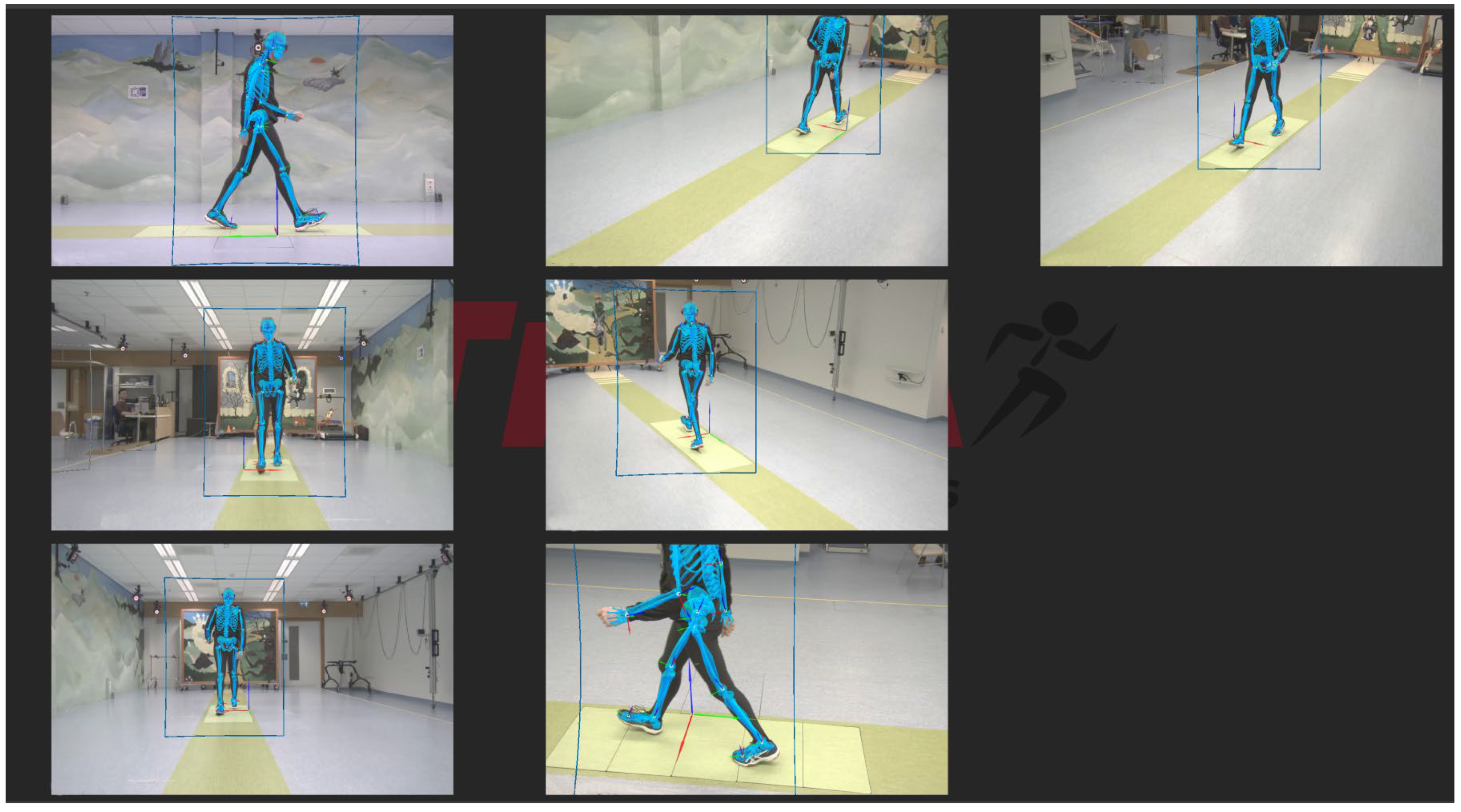 For the markerless processing, video data were transcoded using the h.264 codec within Vicon Nexus software (version 2.16, Vicon, Oxford, UK). The transcoded video files were then processed using Theia3D software (v2023.1.0.3160, Theia Markerless Inc., Kingston, ON, Canada) with default settings, including a 6 Hz low-pass GVCSPL filter. The Theia3D default inverse kinematic model was applied. The output consisted of 4 × 4 transformation matrices for each body segment. For our analysis, only the virtual markers of the segments of the head, pelvis, heels, and toes were used [